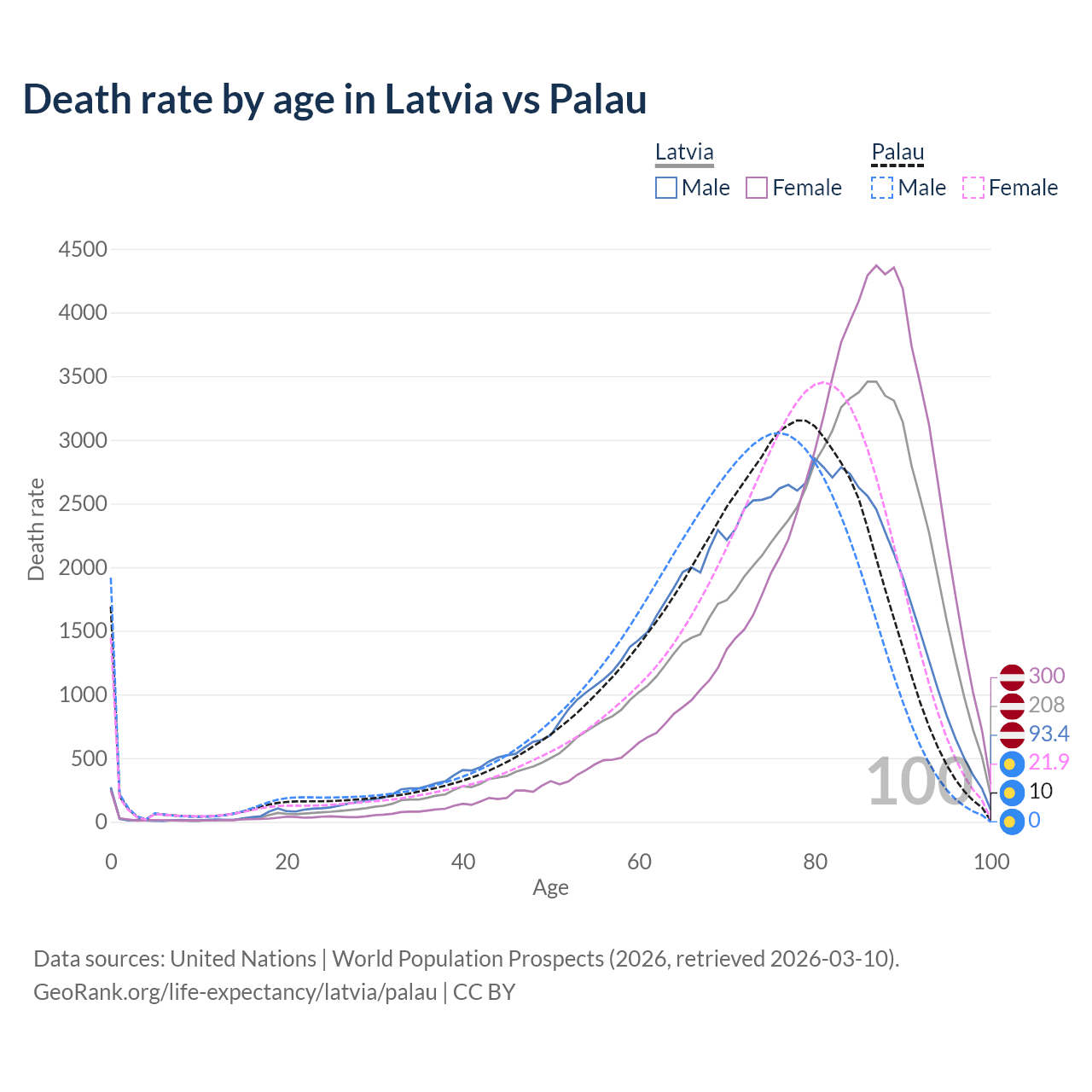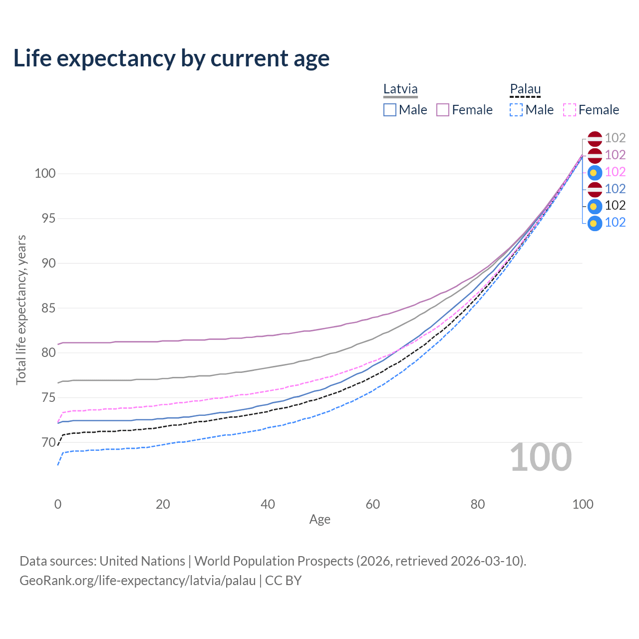 This life expectancy calculator shows the odds of living to 100, 95, 90, and below based on current age for both males and females in Latvia and Palau, along with mean and median age of death. The calculations are based on the 2026 life tables (actuarial tables) from the UN World Population Prospects.