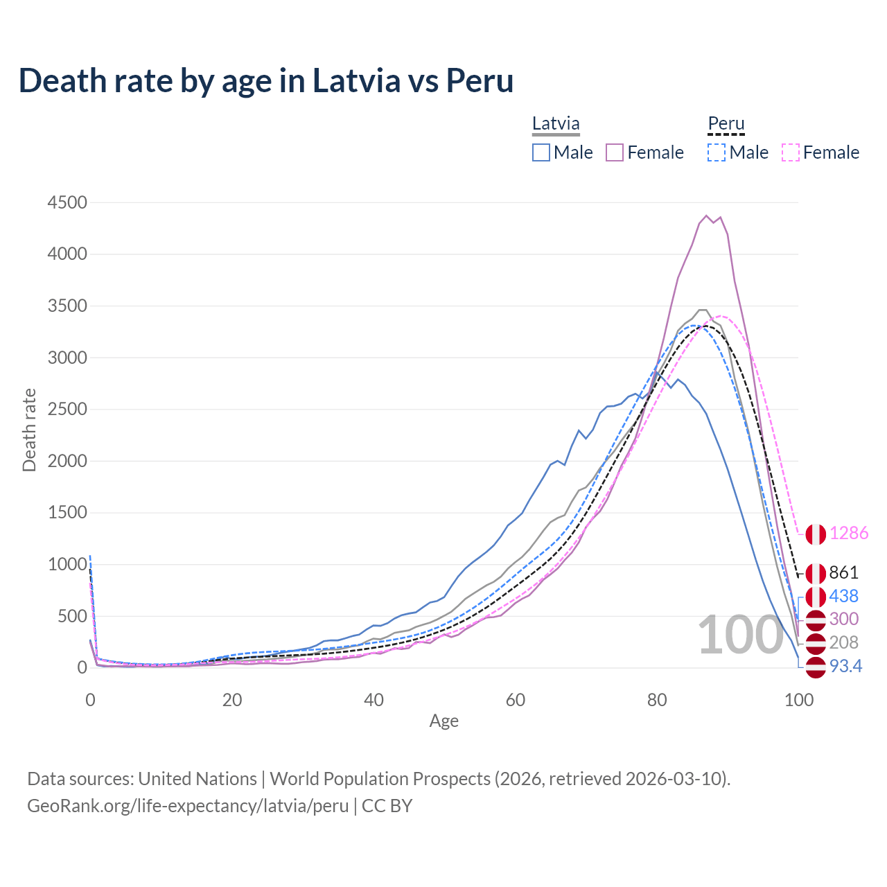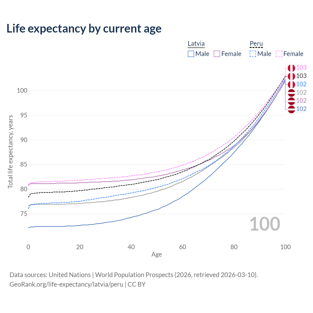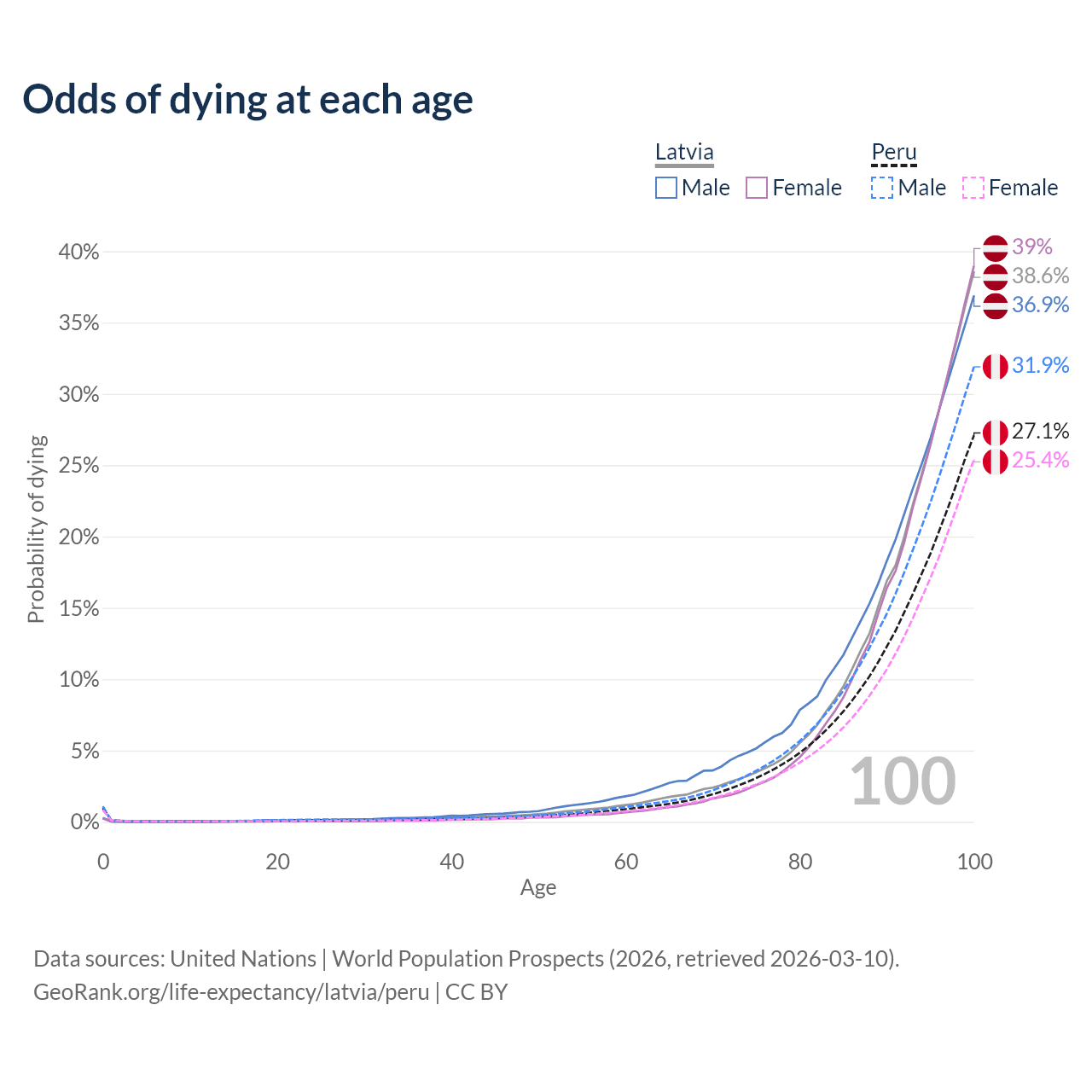 This life expectancy calculator shows the odds of living to 100, 95, 90, and below based on current age for both males and females in Latvia and Peru, along with mean and median age of death. The calculations are based on the 2026 life tables (actuarial tables) from the UN World Population Prospects.