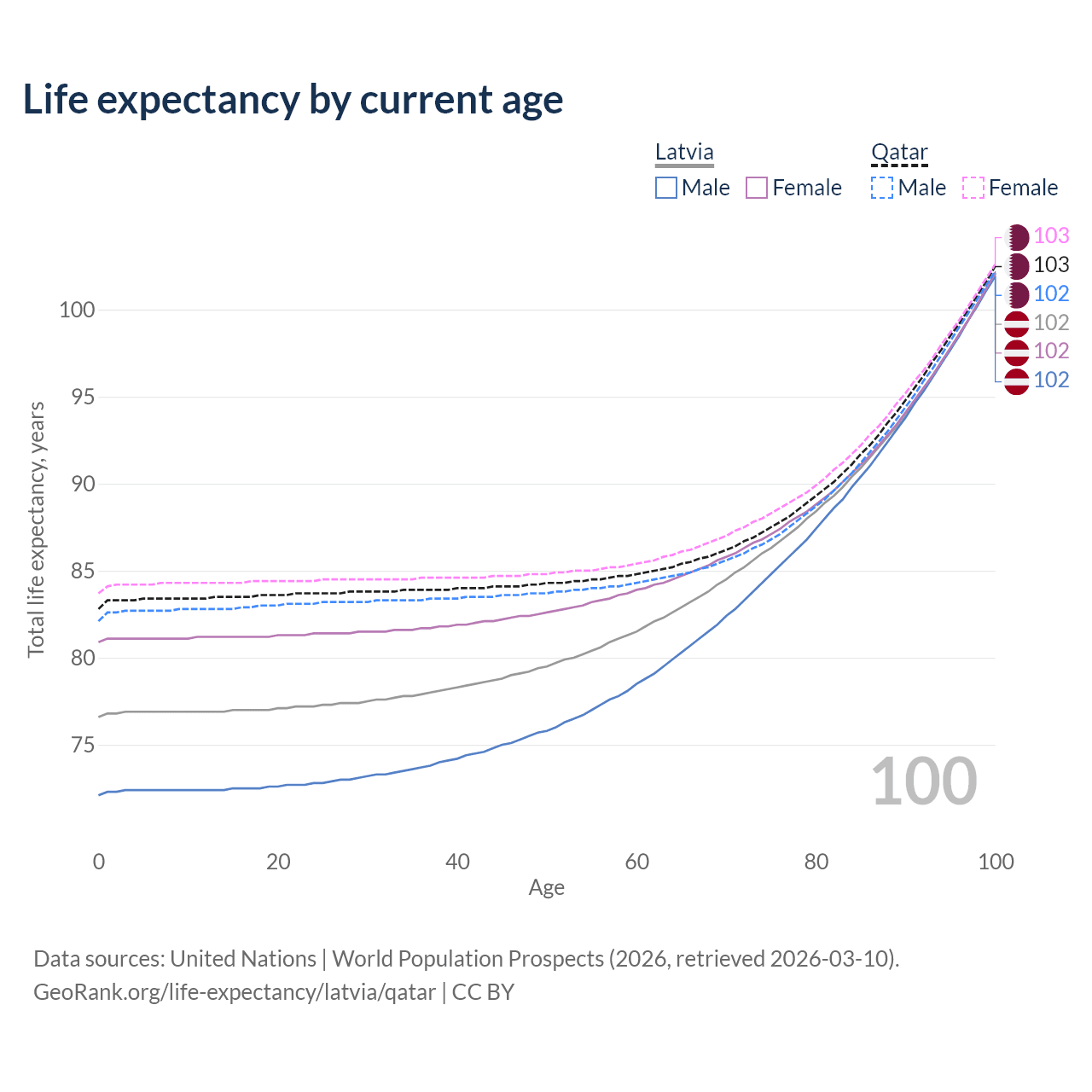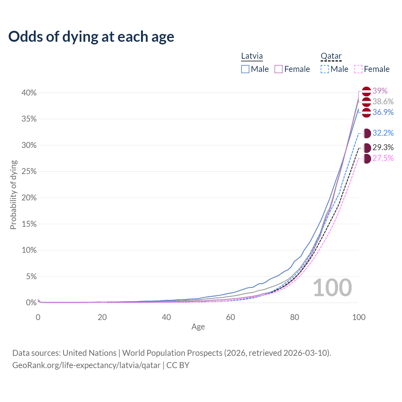 This life expectancy calculator shows the odds of living to 100, 95, 90, and below based on current age for both males and females in Latvia and Qatar, along with mean and median age of death. The calculations are based on the 2026 life tables (actuarial tables) from the UN World Population Prospects.