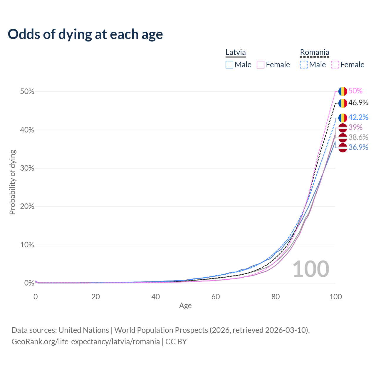 This life expectancy calculator shows the odds of living to 100, 95, 90, and below based on current age for both males and females in Latvia and Romania, along with mean and median age of death. The calculations are based on the 2026 life tables (actuarial tables) from the UN World Population Prospects.