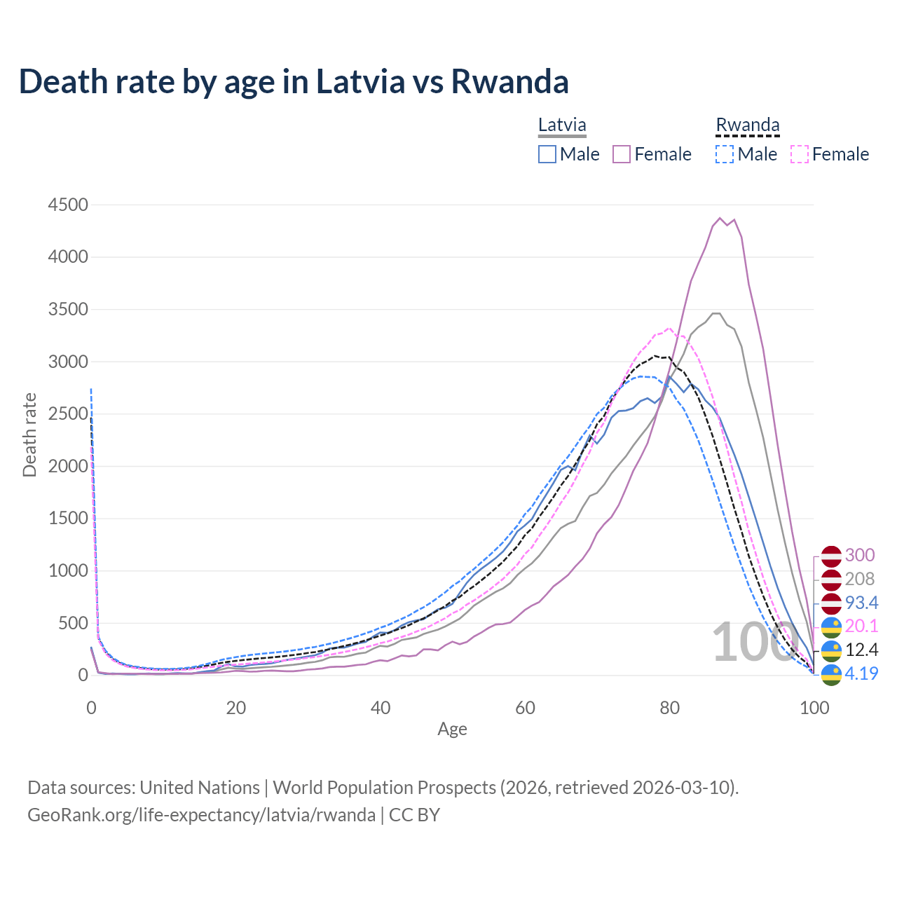 In Latvia, the most common age of death is 87, compared to 78 in Rwanda. The median age of death is 80.4 in Latvia and 73.5 in Rwanda, meaning only half of each cohort is expected to live past that age.