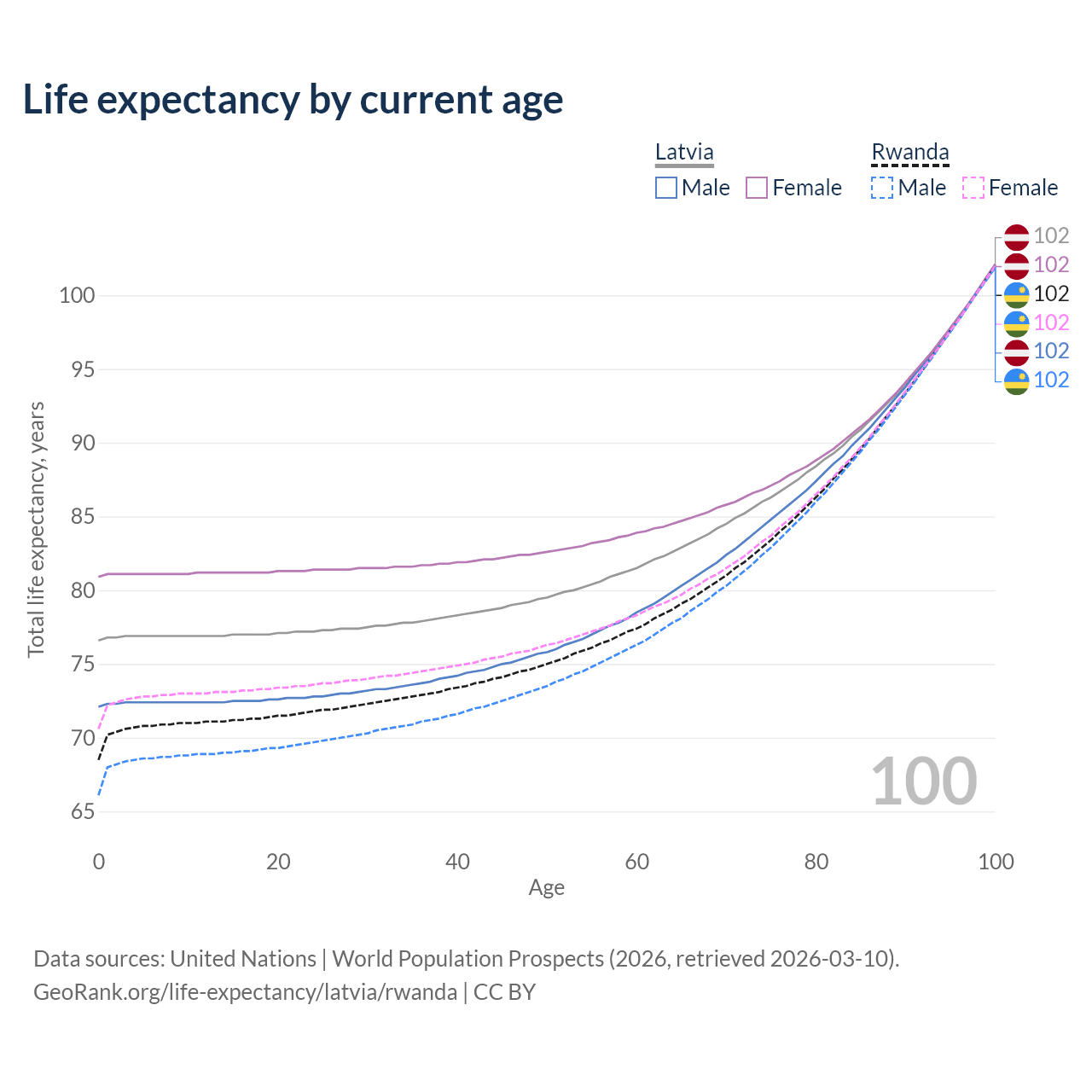 This life expectancy calculator shows the odds of living to 100, 95, 90, and below based on current age for both males and females in Latvia and Rwanda, along with mean and median age of death. The calculations are based on the 2026 life tables (actuarial tables) from the UN World Population Prospects.