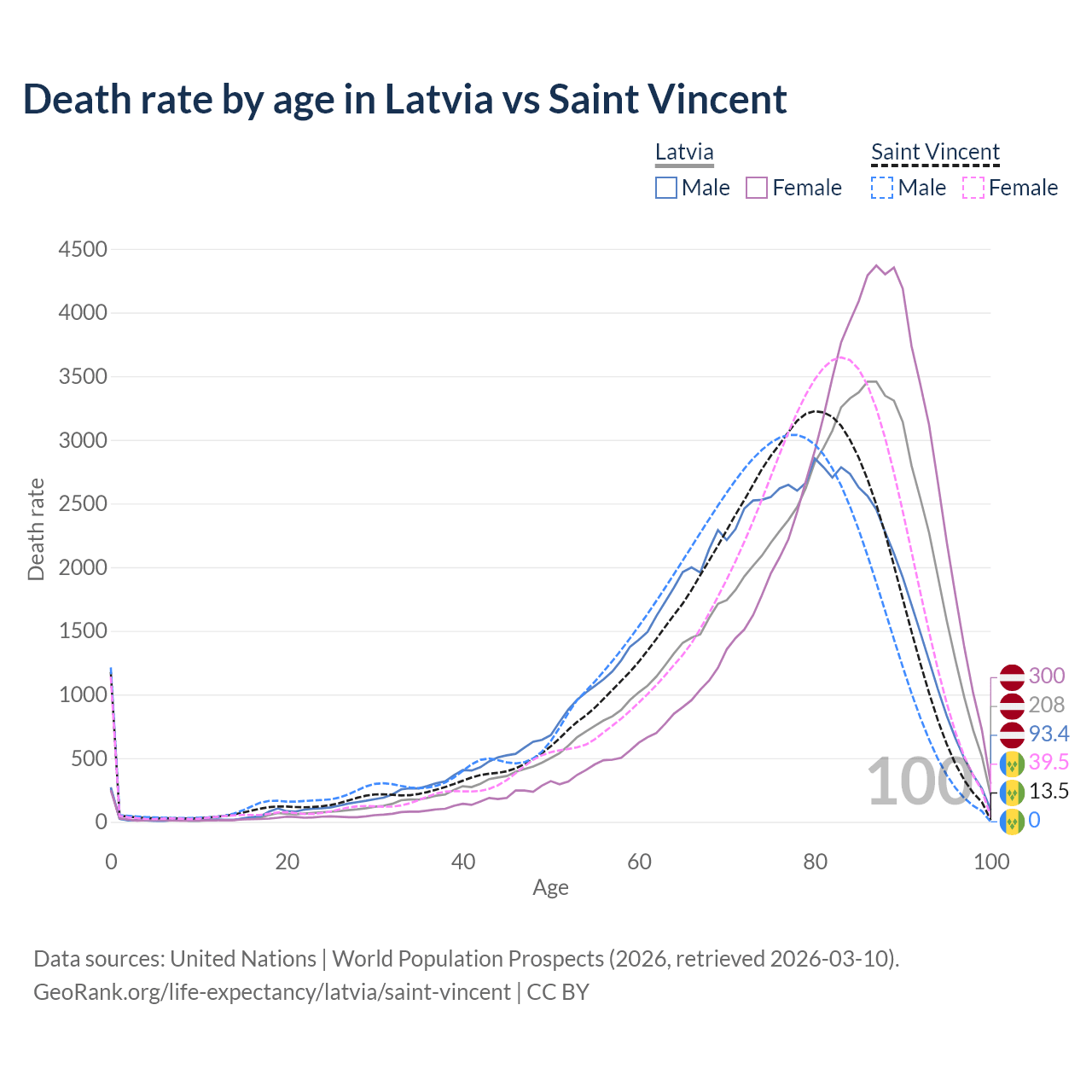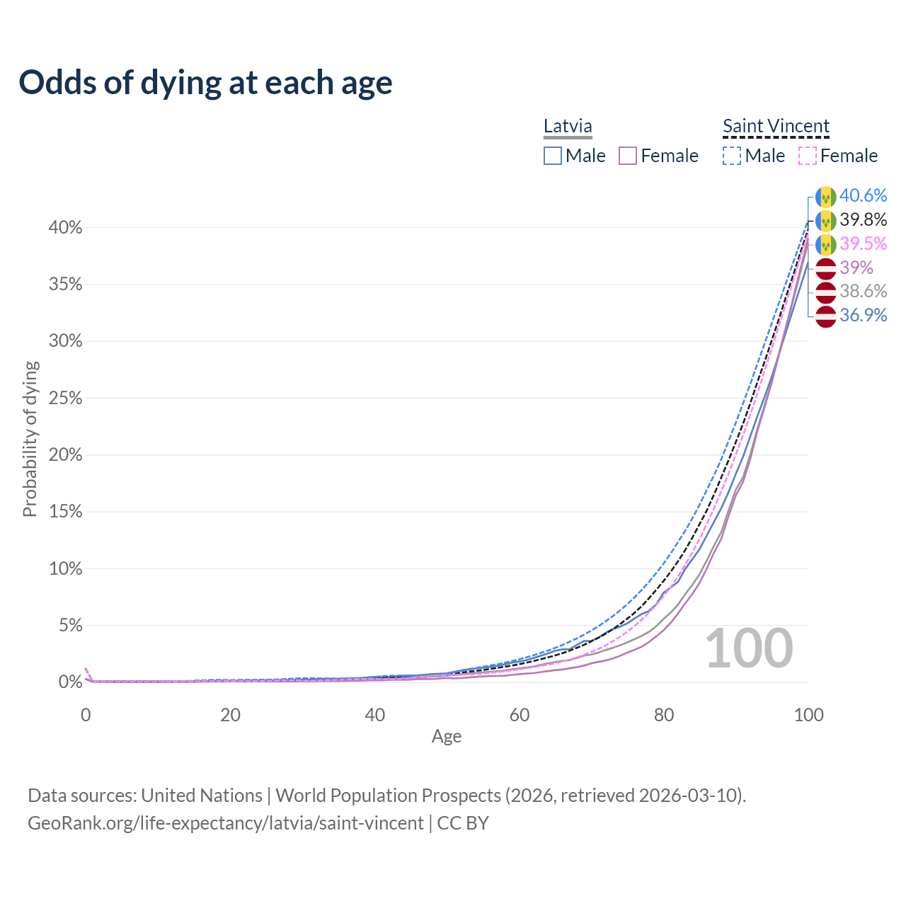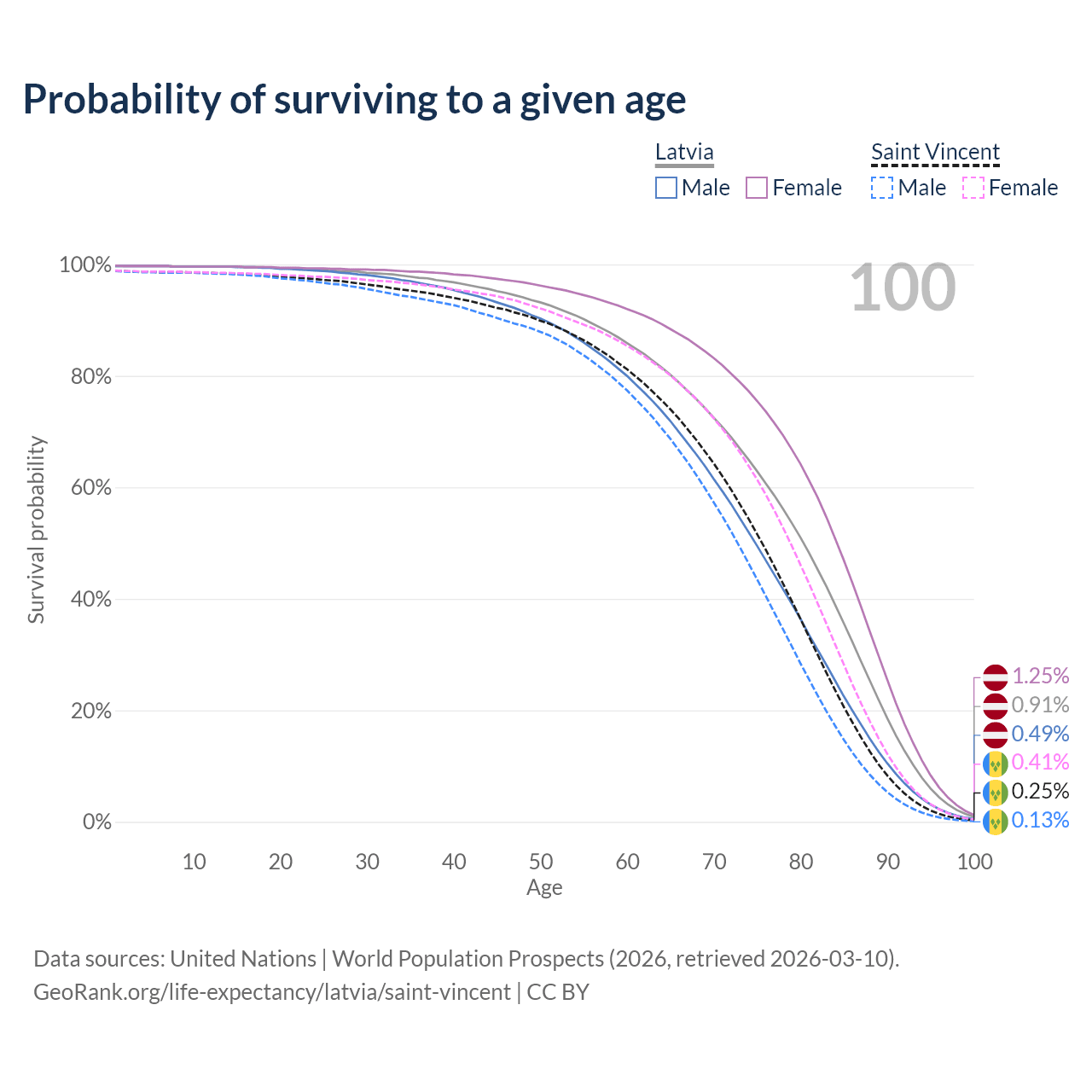 This life expectancy calculator shows the odds of living to 100, 95, 90, and below based on current age for both males and females in Latvia and Saint Vincent, along with mean and median age of death. The calculations are based on the 2026 life tables (actuarial tables) from the UN World Population Prospects.