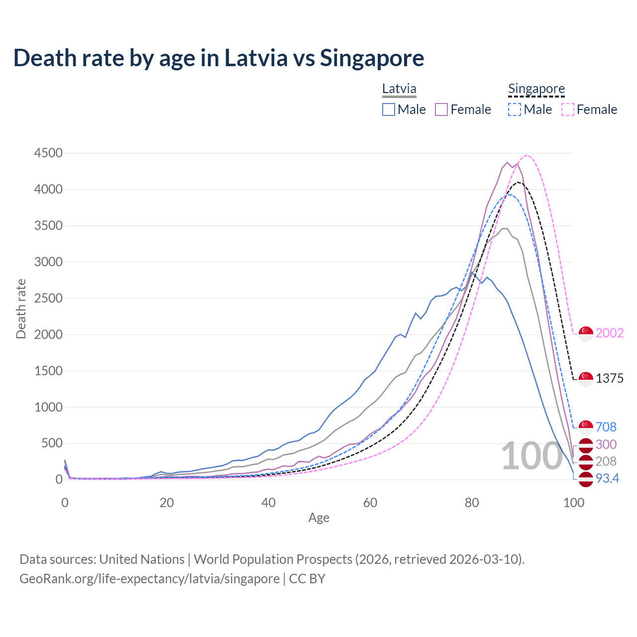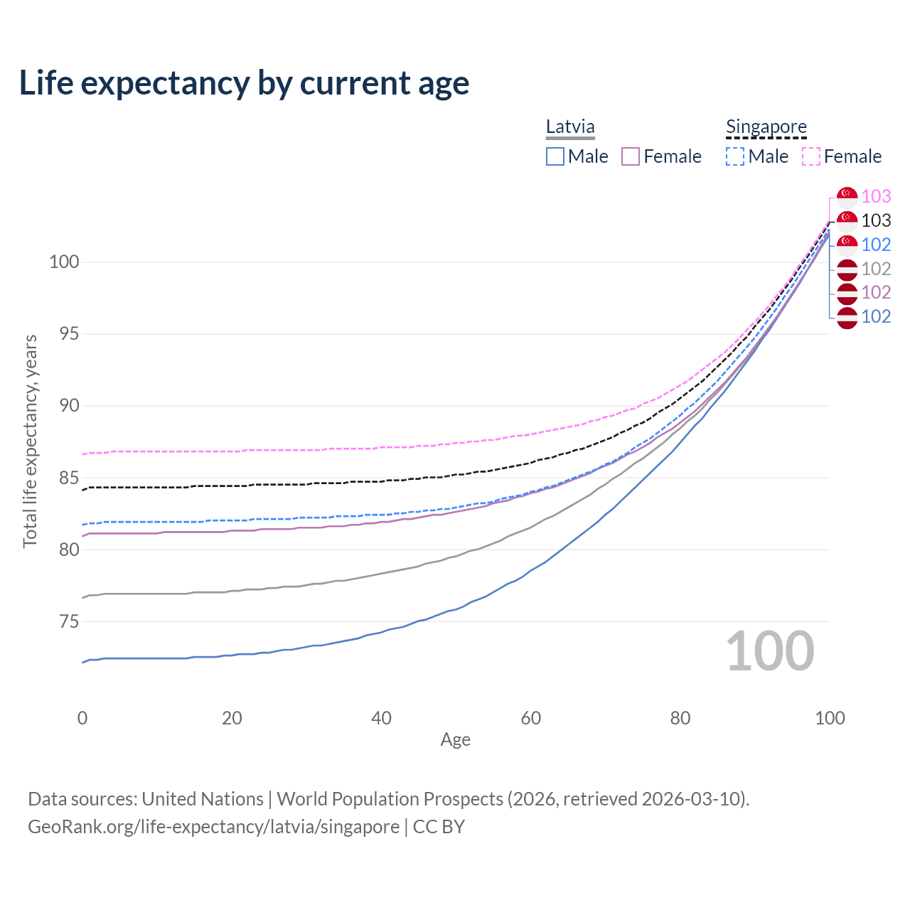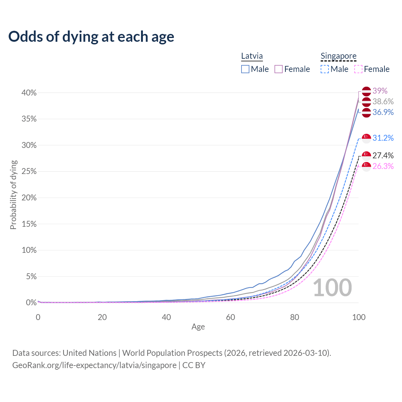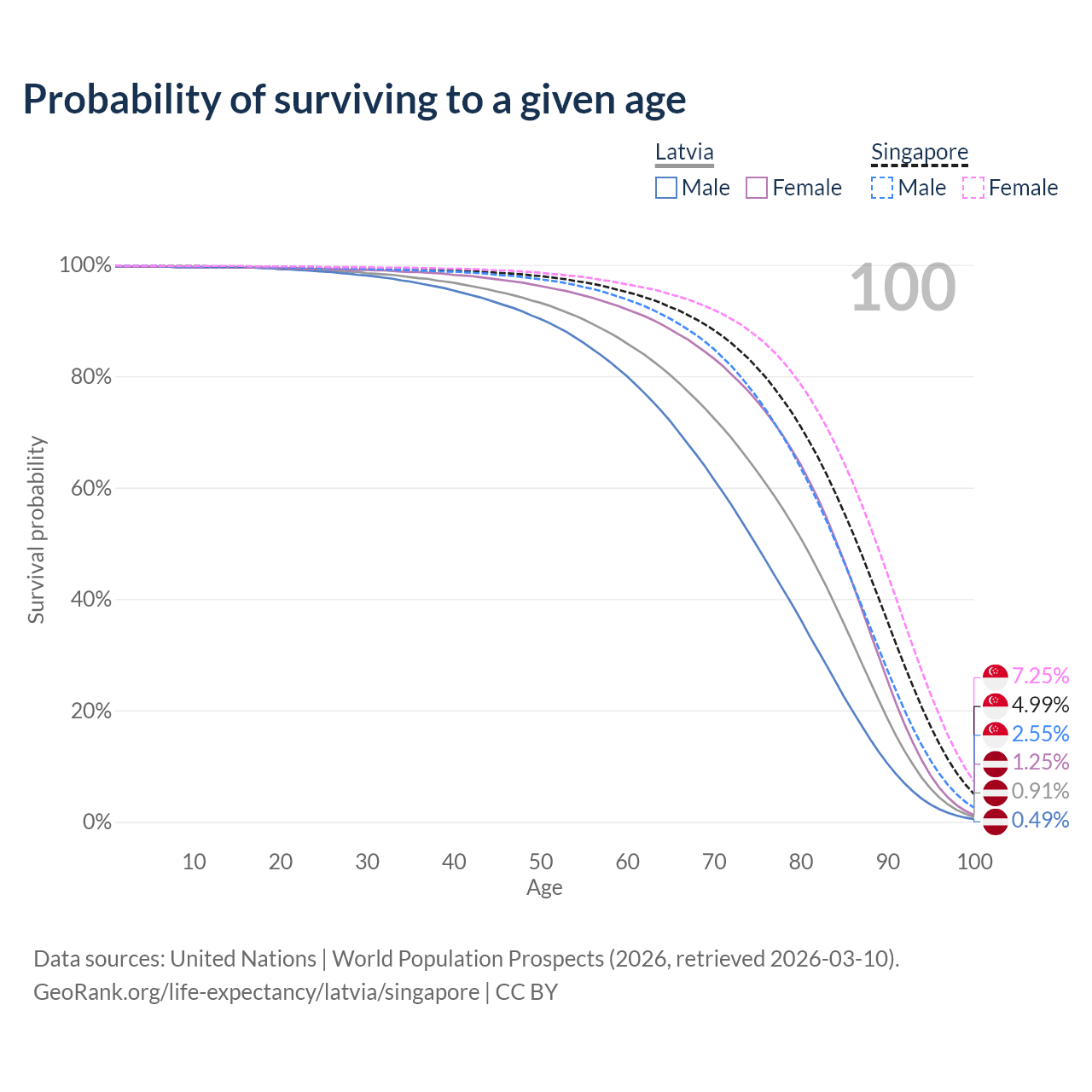 This life expectancy calculator shows the odds of living to 100, 95, 90, and below based on current age for both males and females in Latvia and Singapore, along with mean and median age of death. The calculations are based on the 2026 life tables (actuarial tables) from the UN World Population Prospects.