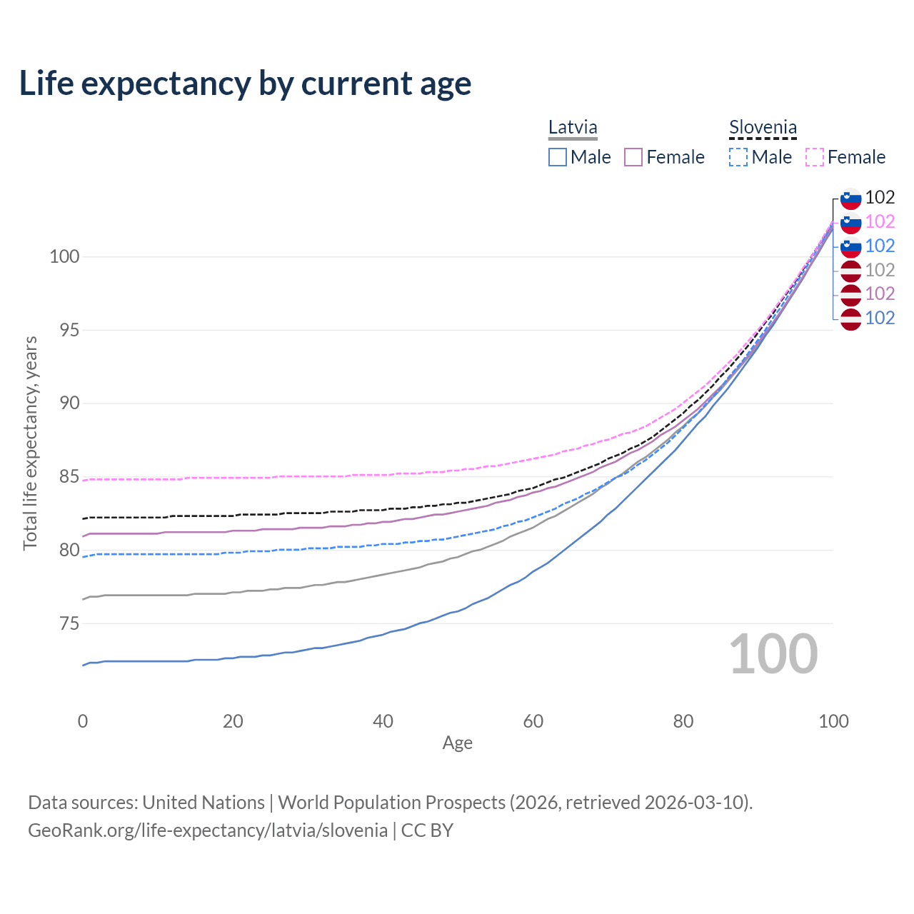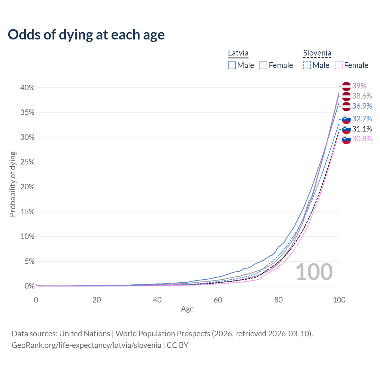 This life expectancy calculator shows the odds of living to 100, 95, 90, and below based on current age for both males and females in Latvia and Slovenia, along with mean and median age of death. The calculations are based on the 2026 life tables (actuarial tables) from the UN World Population Prospects.