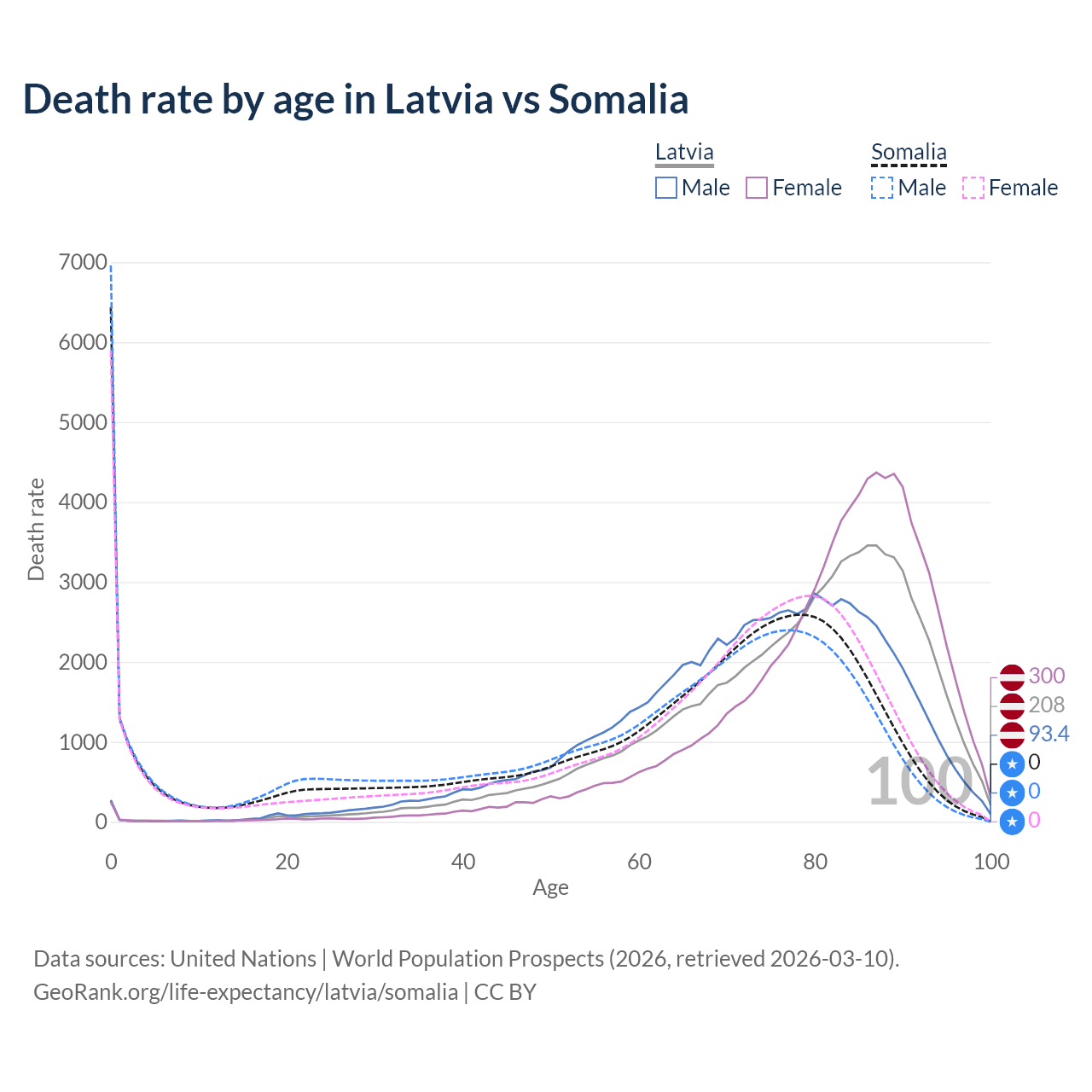 In Latvia, the most common age of death is 87, compared to 0 in Somalia. The median age of death is 80.4 in Latvia and 69 in Somalia, meaning only half of each cohort is expected to live past that age.