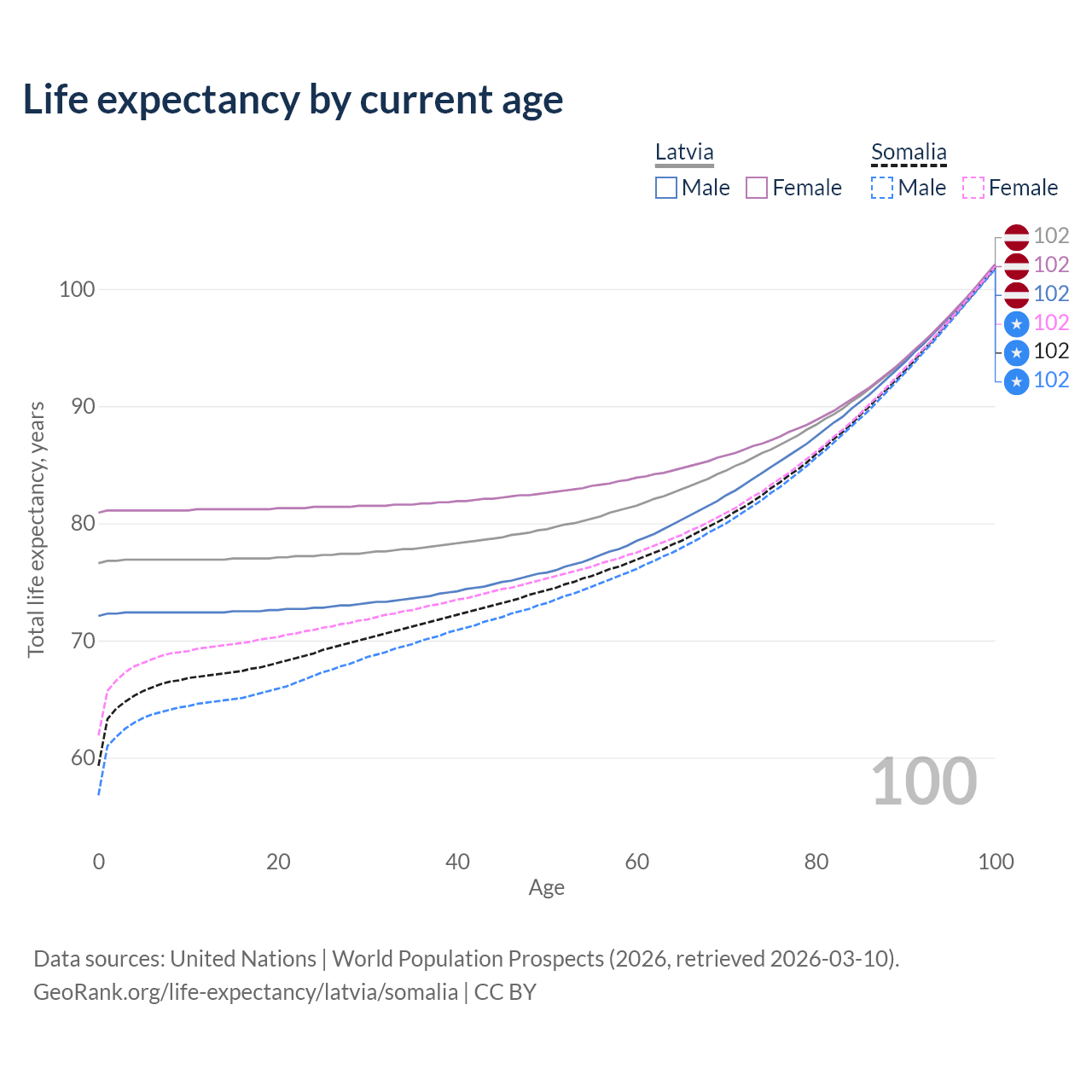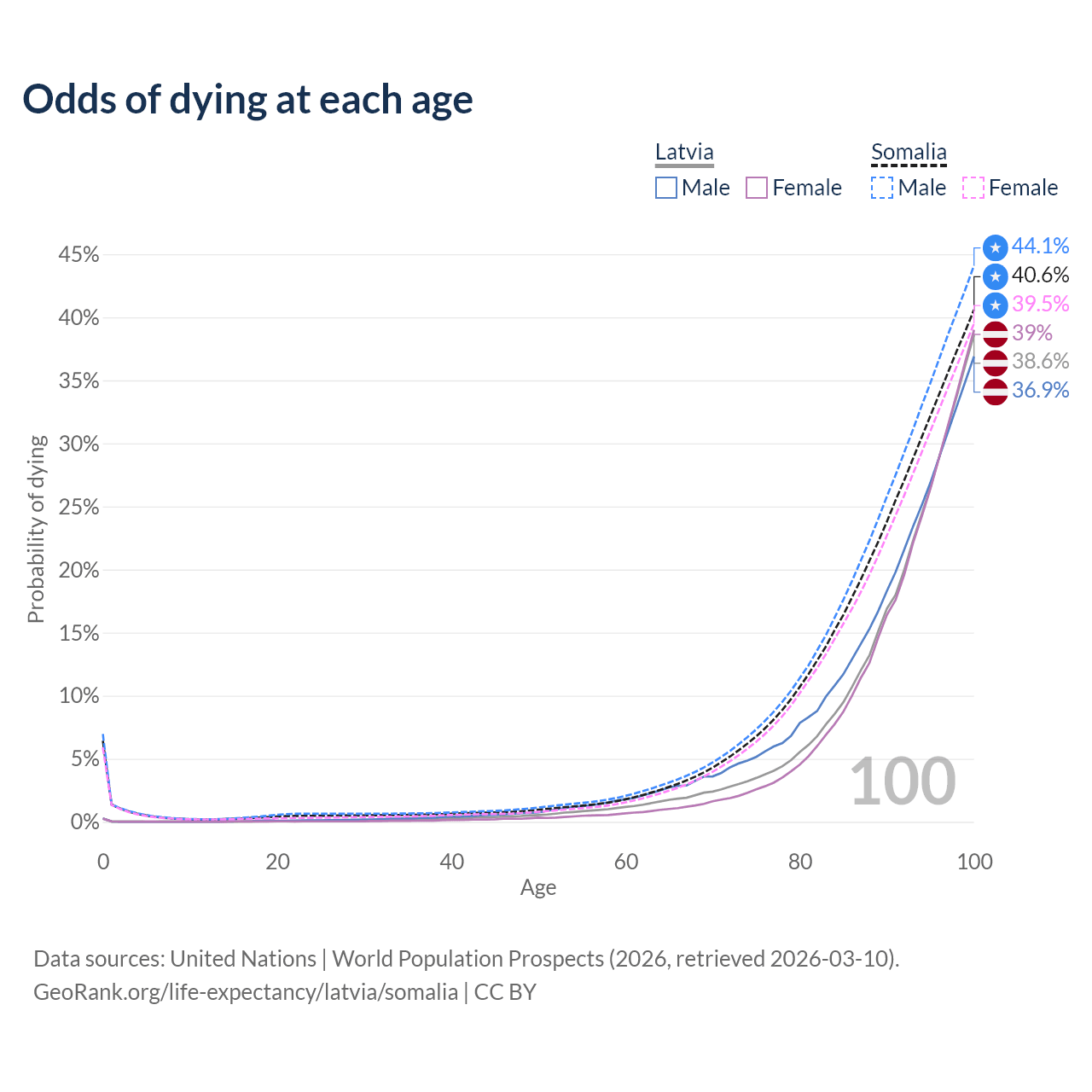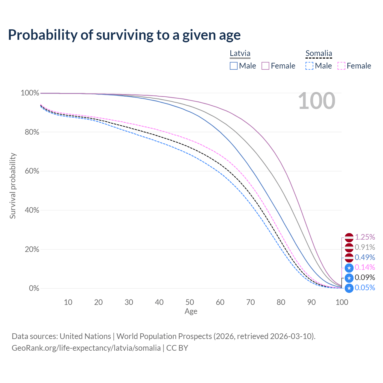 This life expectancy calculator shows the odds of living to 100, 95, 90, and below based on current age for both males and females in Latvia and Somalia, along with mean and median age of death. The calculations are based on the 2026 life tables (actuarial tables) from the UN World Population Prospects.