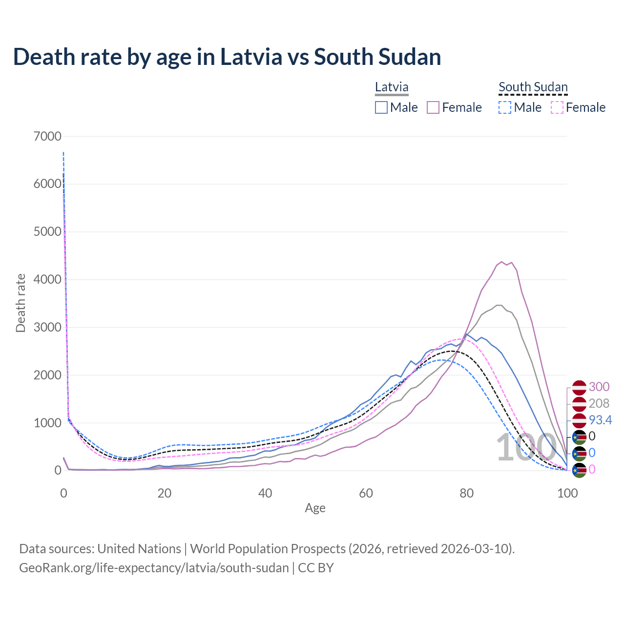 In Latvia, the most common age of death is 87, compared to 0 in South Sudan. The median age of death is 80.4 in Latvia and 67.5 in South Sudan, meaning only half of each cohort is expected to live past that age.