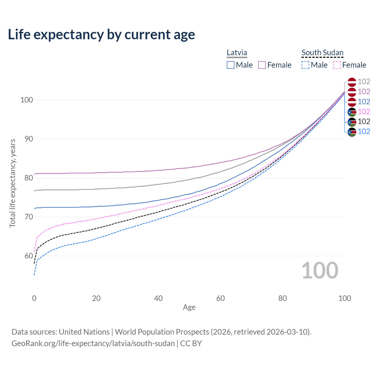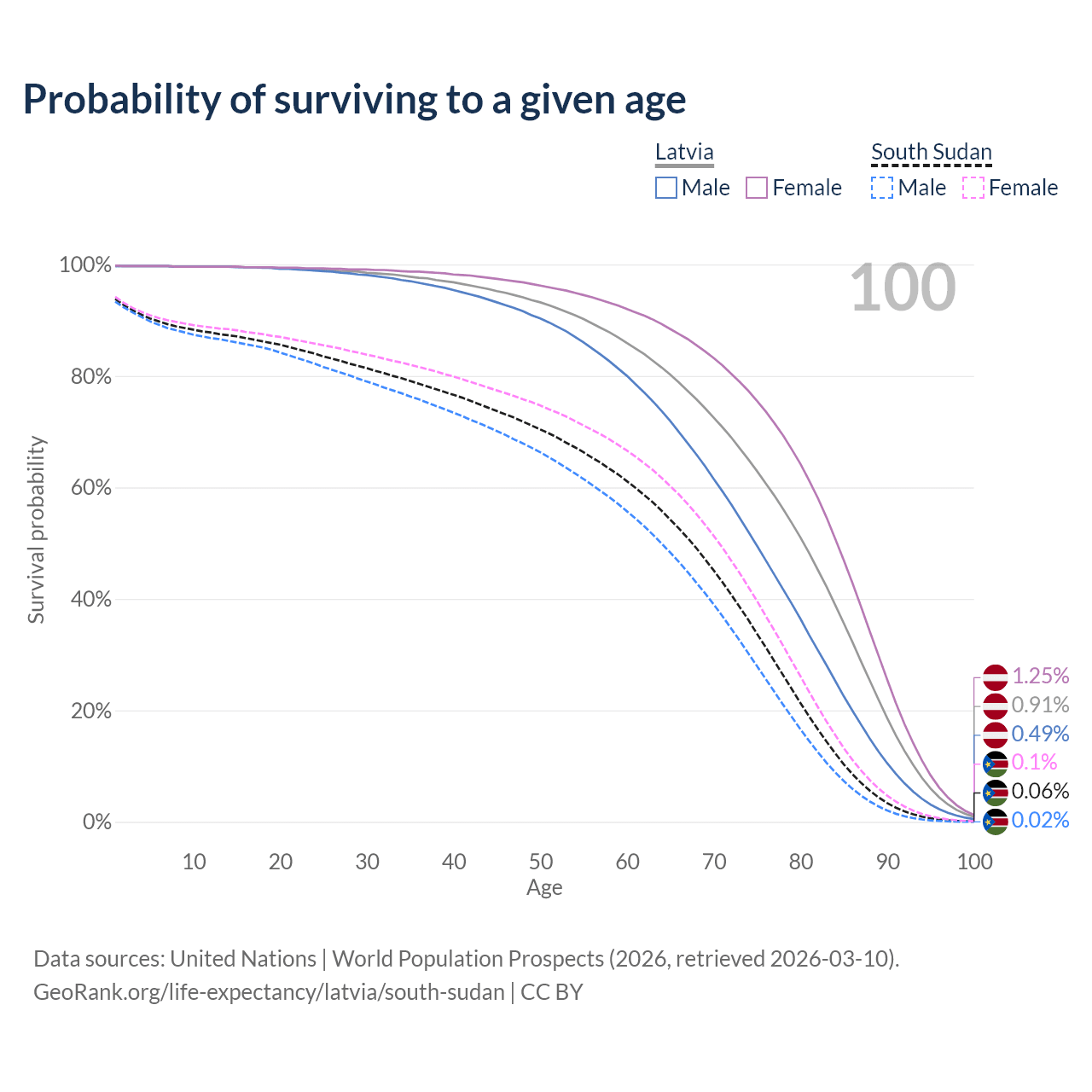 This life expectancy calculator shows the odds of living to 100, 95, 90, and below based on current age for both males and females in Latvia and South Sudan, along with mean and median age of death. The calculations are based on the 2026 life tables (actuarial tables) from the UN World Population Prospects.