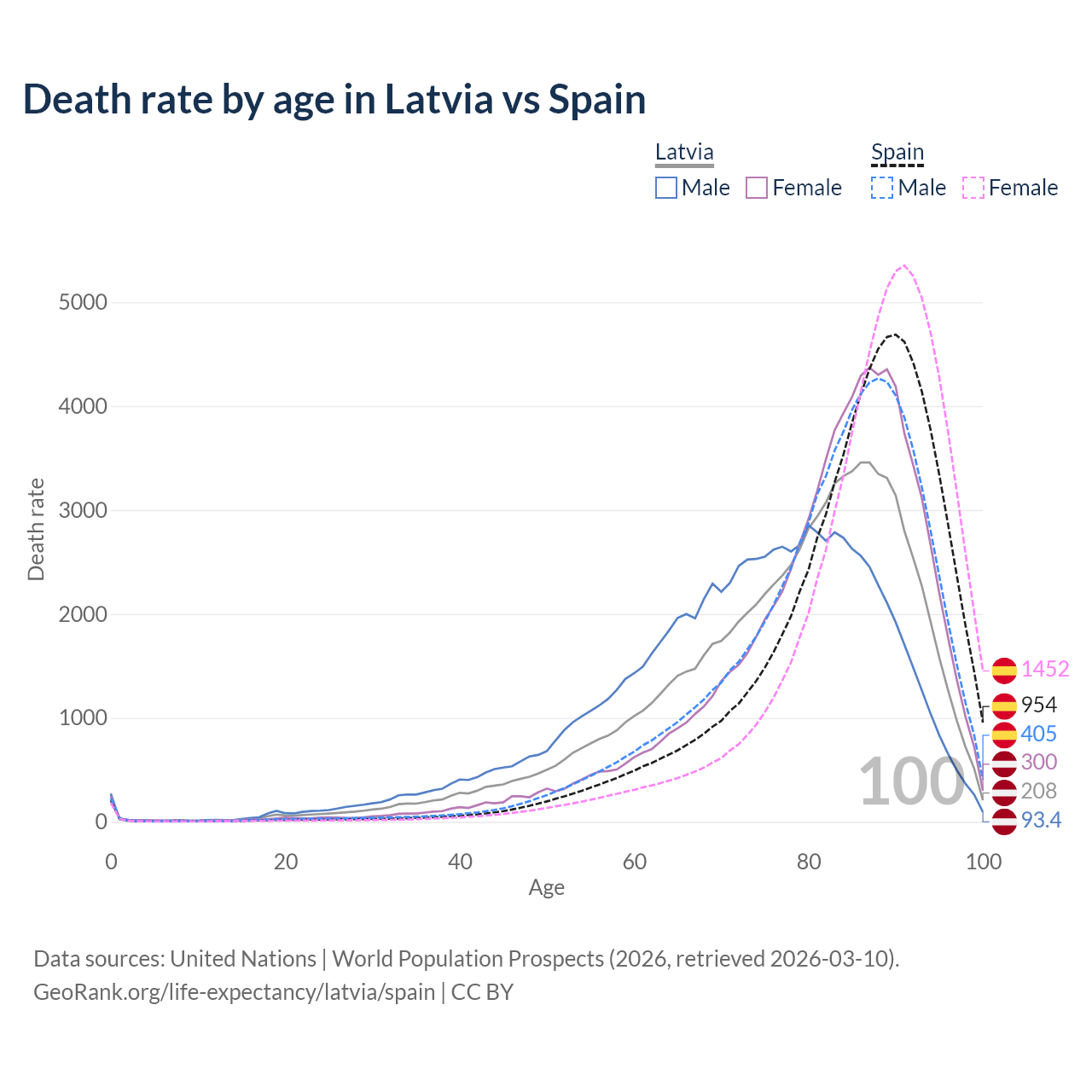 In Latvia, the most common age of death is 87, compared to 90 in Spain. The median age of death is 80.4 in Latvia and 87 in Spain, meaning only half of each cohort is expected to live past that age.