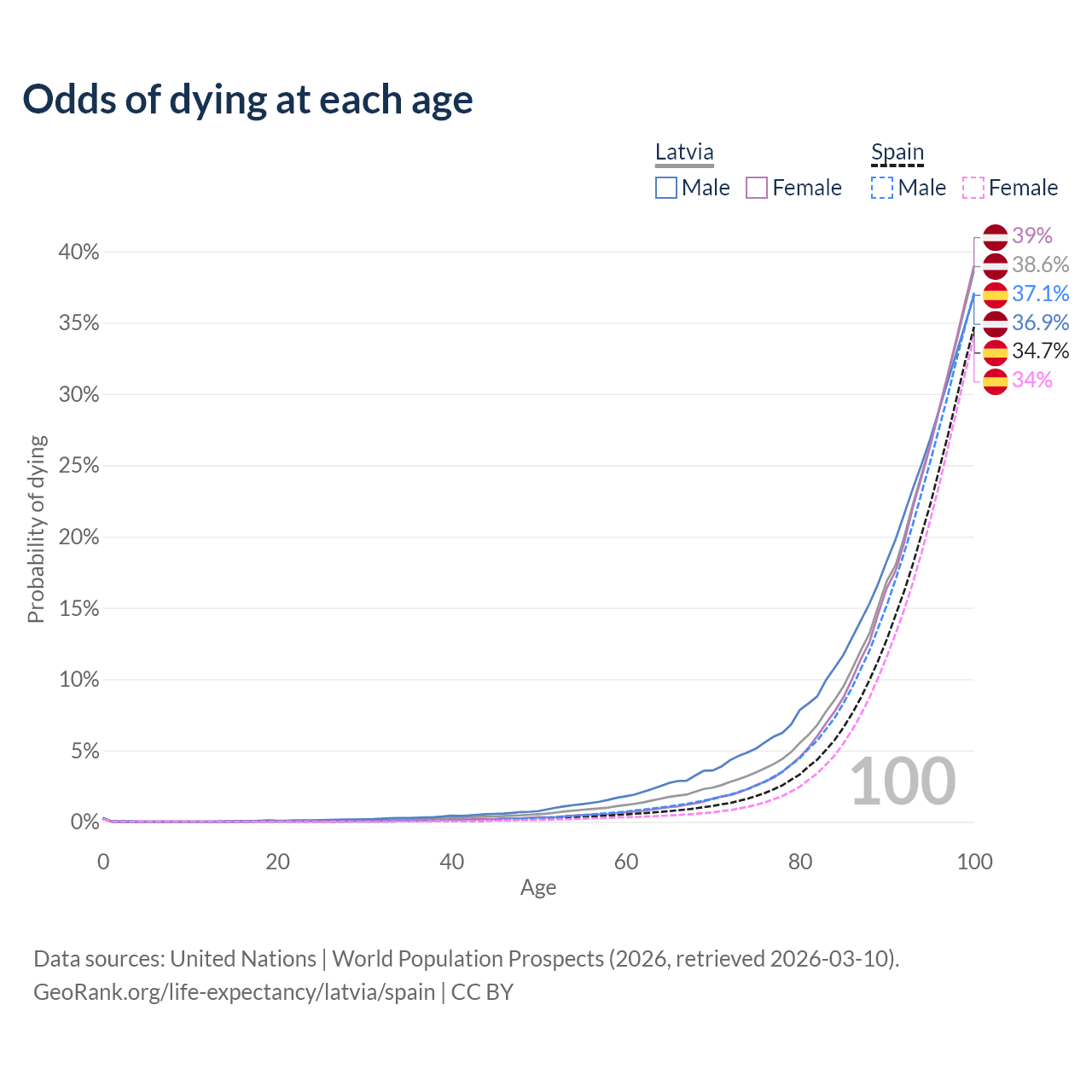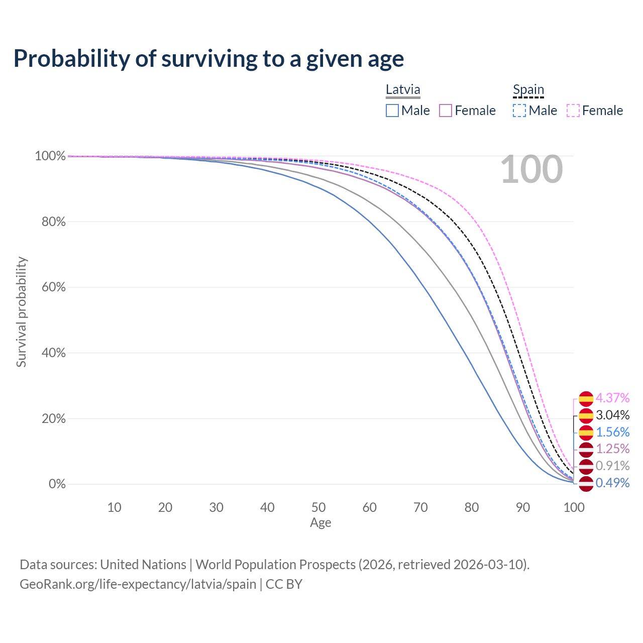 This life expectancy calculator shows the odds of living to 100, 95, 90, and below based on current age for both males and females in Latvia and Spain, along with mean and median age of death. The calculations are based on the 2026 life tables (actuarial tables) from the UN World Population Prospects.