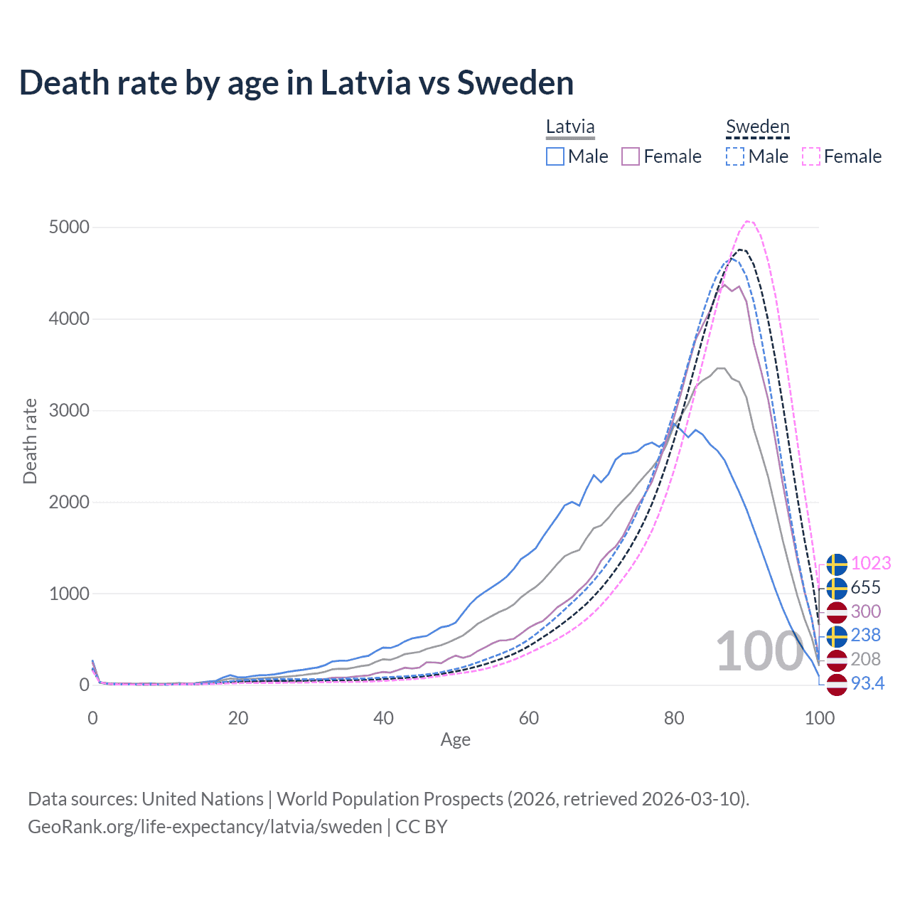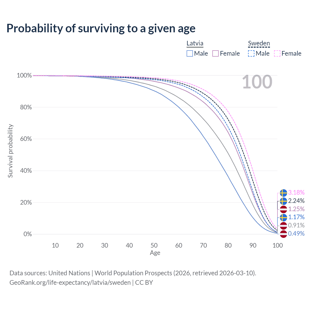 This life expectancy calculator shows the odds of living to 100, 95, 90, and below based on current age for both males and females in Latvia and Sweden, along with mean and median age of death. The calculations are based on the 2026 life tables (actuarial tables) from the UN World Population Prospects.