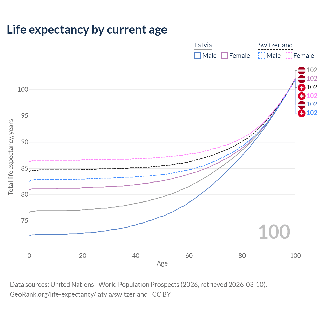 This life expectancy calculator shows the odds of living to 100, 95, 90, and below based on current age for both males and females in Latvia and Switzerland, along with mean and median age of death. The calculations are based on the 2026 life tables (actuarial tables) from the UN World Population Prospects.