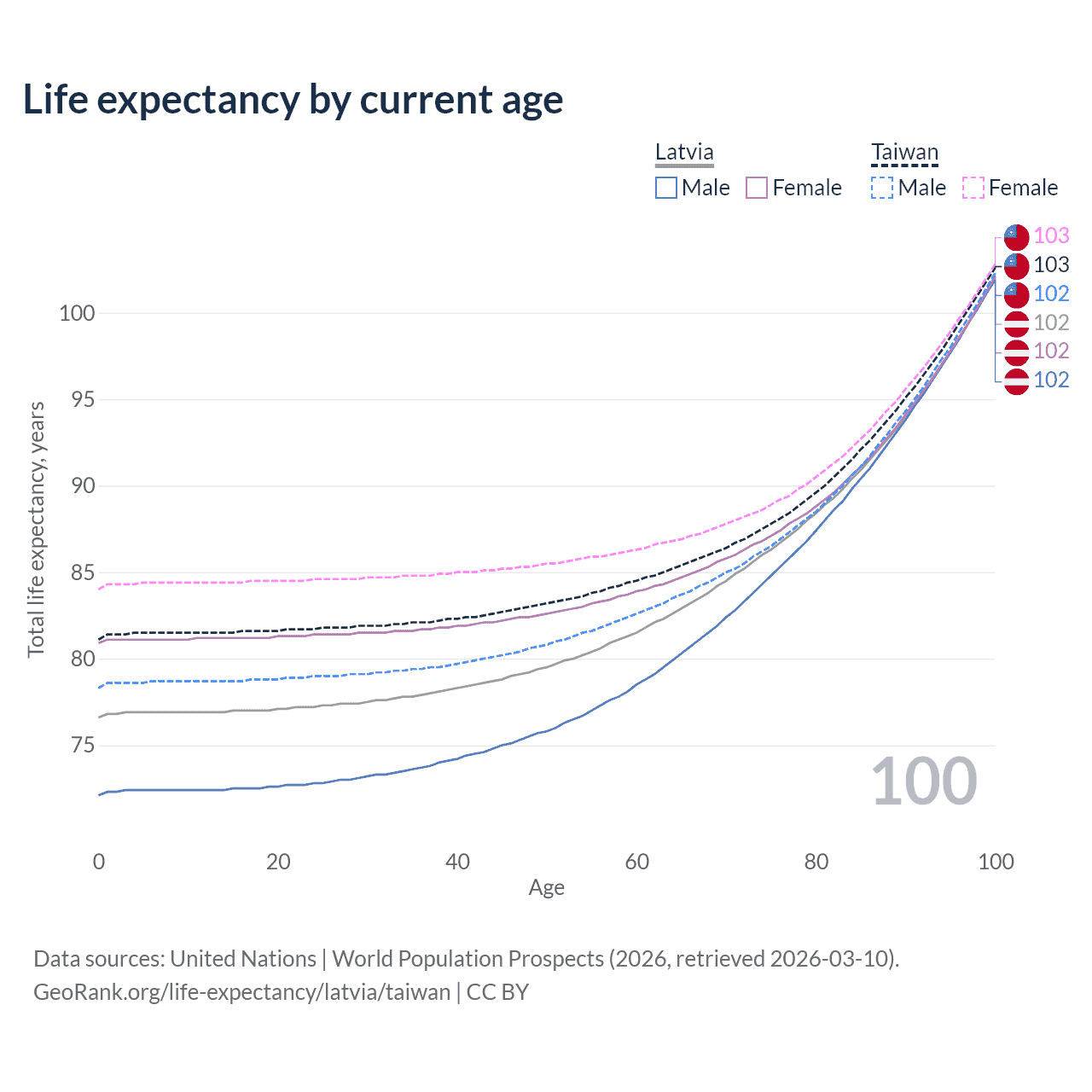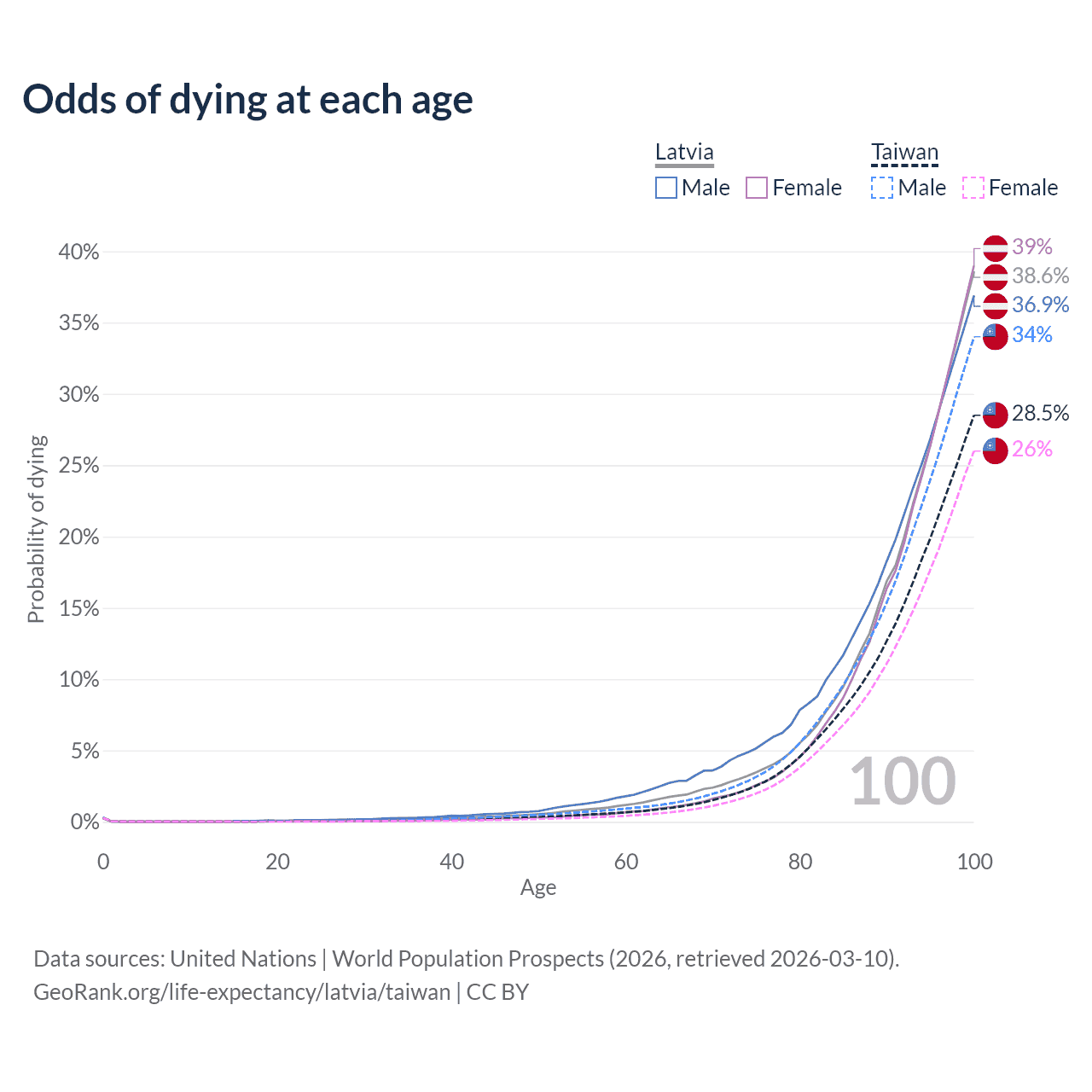 This life expectancy calculator shows the odds of living to 100, 95, 90, and below based on current age for both males and females in Latvia and Taiwan, along with mean and median age of death. The calculations are based on the 2026 life tables (actuarial tables) from the UN World Population Prospects.