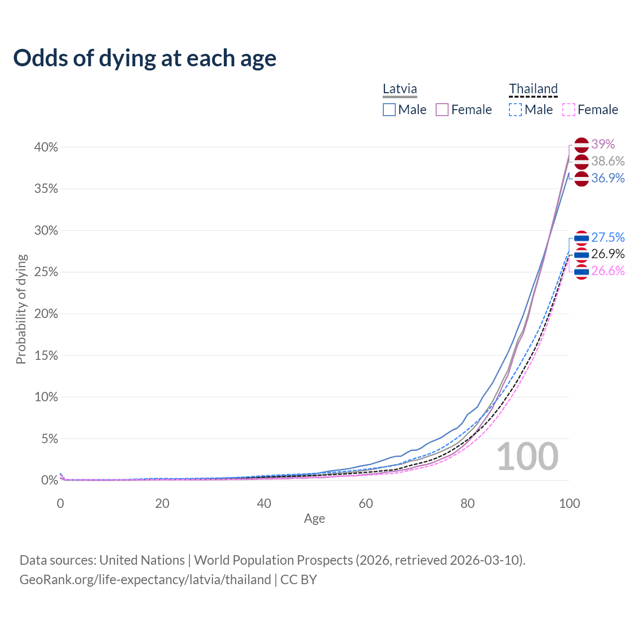 This life expectancy calculator shows the odds of living to 100, 95, 90, and below based on current age for both males and females in Latvia and Thailand, along with mean and median age of death. The calculations are based on the 2026 life tables (actuarial tables) from the UN World Population Prospects.