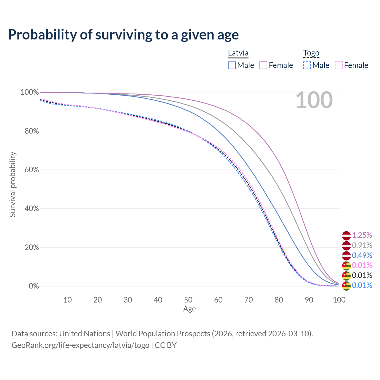 This life expectancy calculator shows the odds of living to 100, 95, 90, and below based on current age for both males and females in Latvia and Togo, along with mean and median age of death. The calculations are based on the 2026 life tables (actuarial tables) from the UN World Population Prospects.