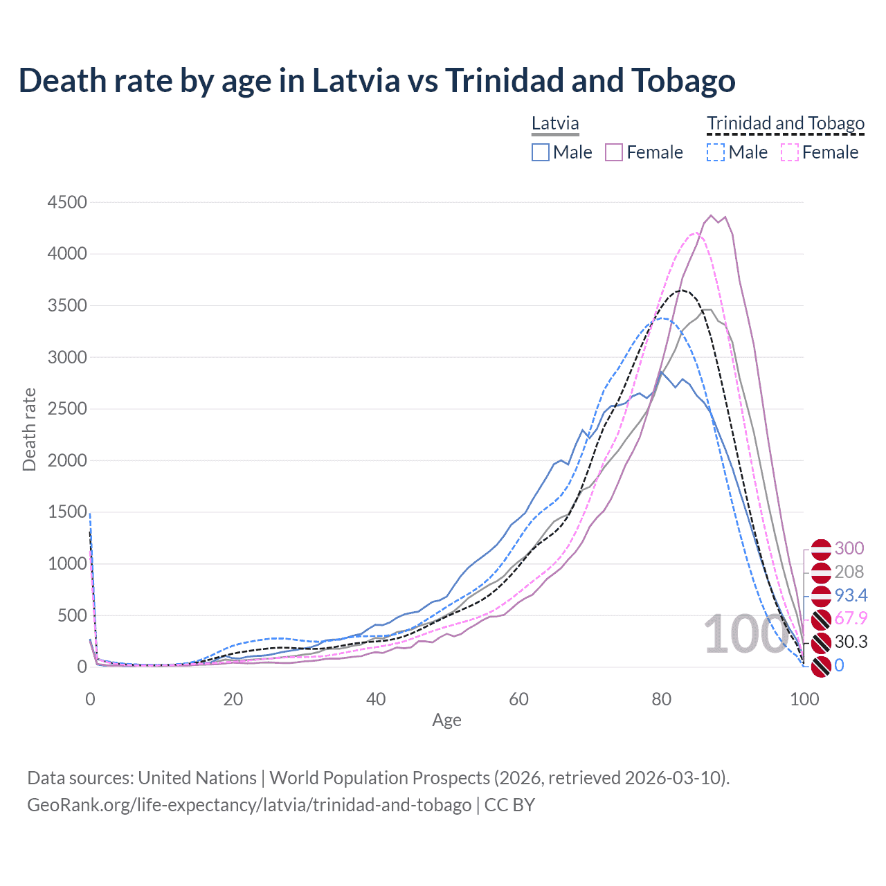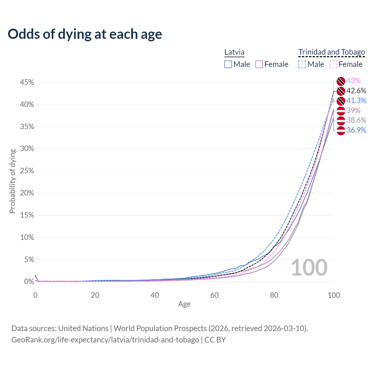 This life expectancy calculator shows the odds of living to 100, 95, 90, and below based on current age for both males and females in Latvia and Trinidad and Tobago, along with mean and median age of death. The calculations are based on the 2026 life tables (actuarial tables) from the UN World Population Prospects.