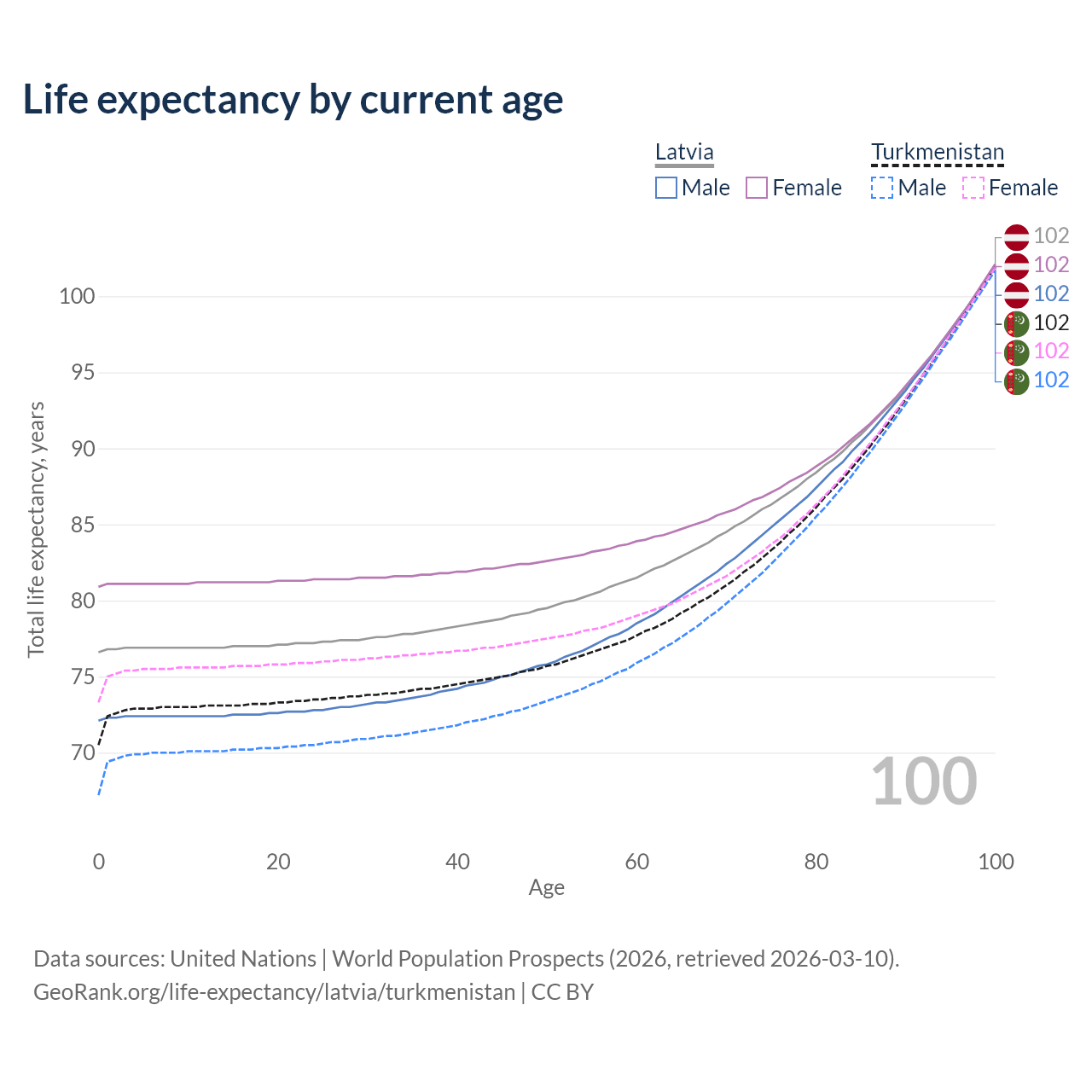 This life expectancy calculator shows the odds of living to 100, 95, 90, and below based on current age for both males and females in Latvia and Turkmenistan, along with mean and median age of death. The calculations are based on the 2026 life tables (actuarial tables) from the UN World Population Prospects.