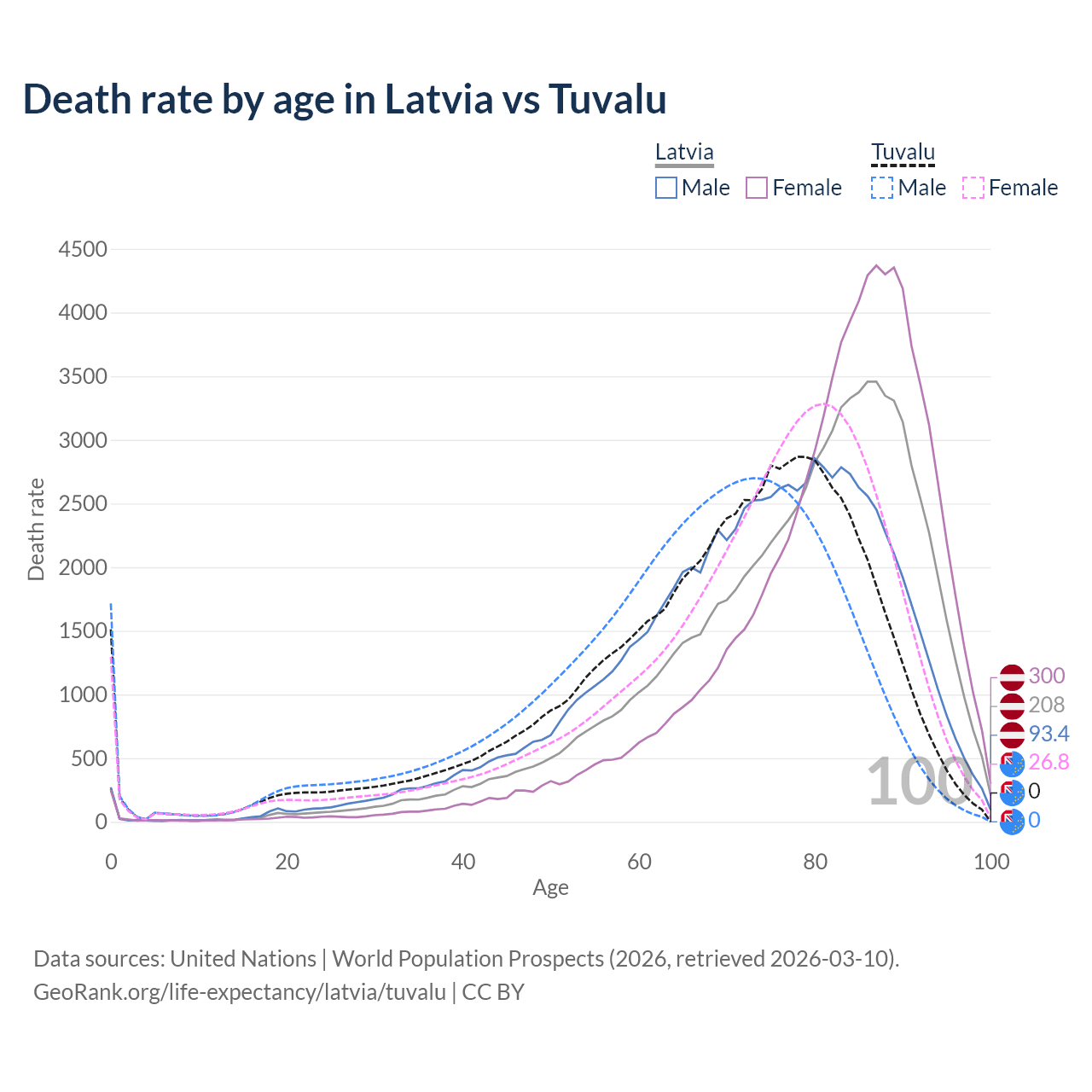 In Latvia, the most common age of death is 87, compared to 78 in Tuvalu. The median age of death is 80.4 in Latvia and 71.9 in Tuvalu, meaning only half of each cohort is expected to live past that age.