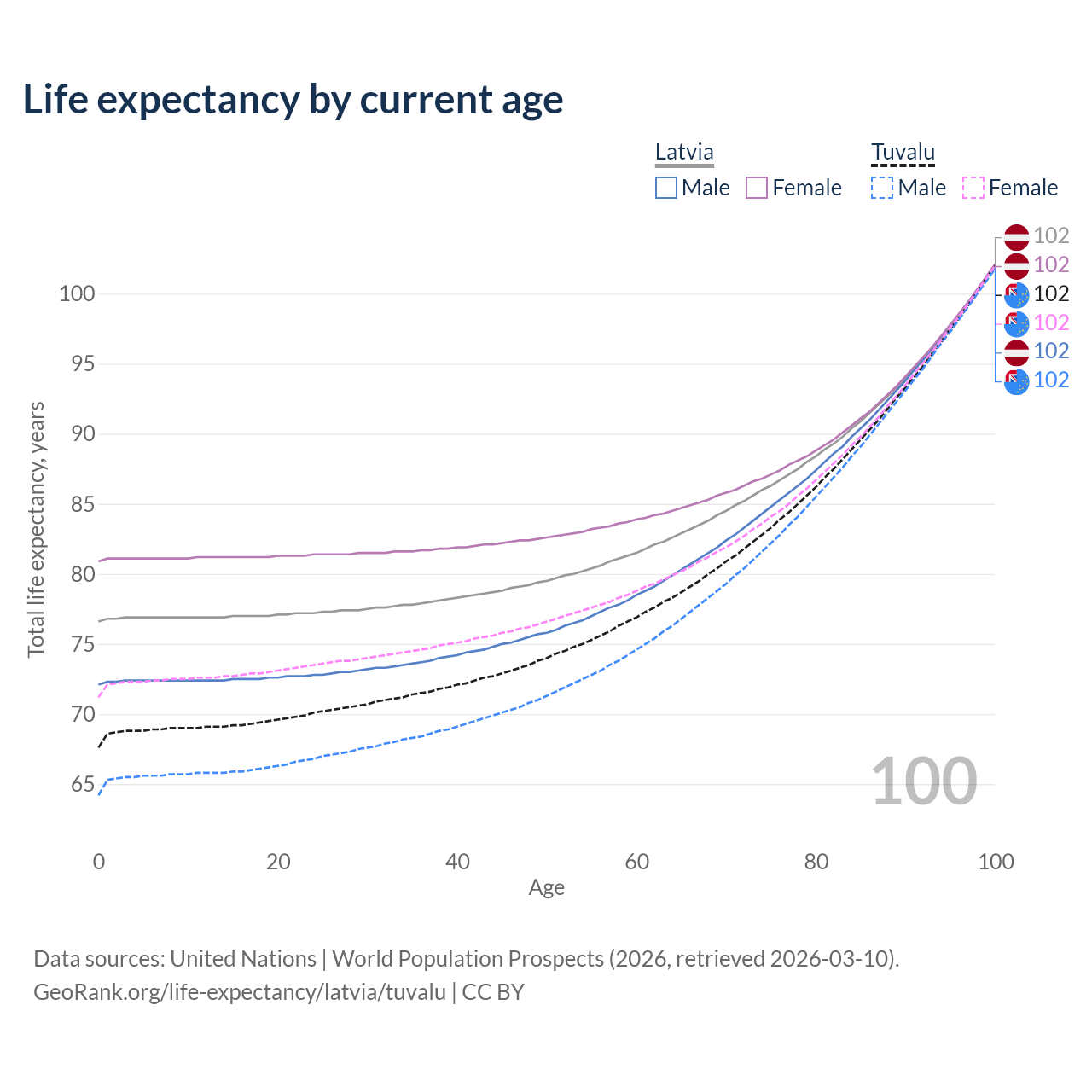 This life expectancy calculator shows the odds of living to 100, 95, 90, and below based on current age for both males and females in Latvia and Tuvalu, along with mean and median age of death. The calculations are based on the 2026 life tables (actuarial tables) from the UN World Population Prospects.