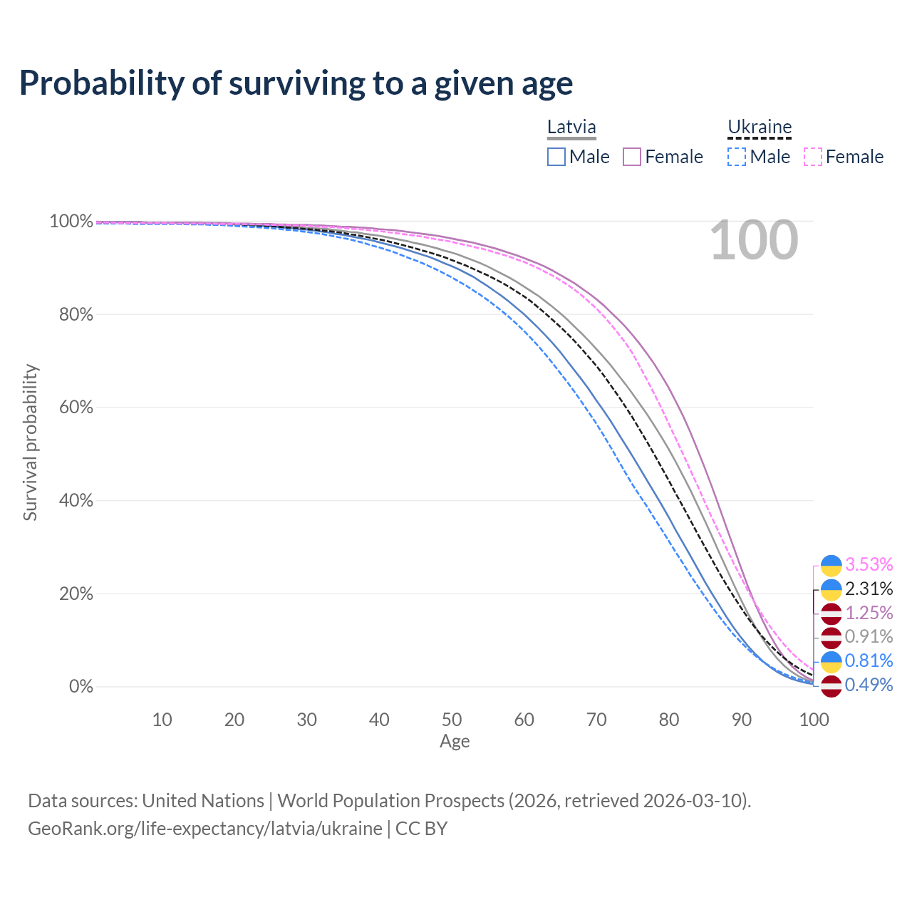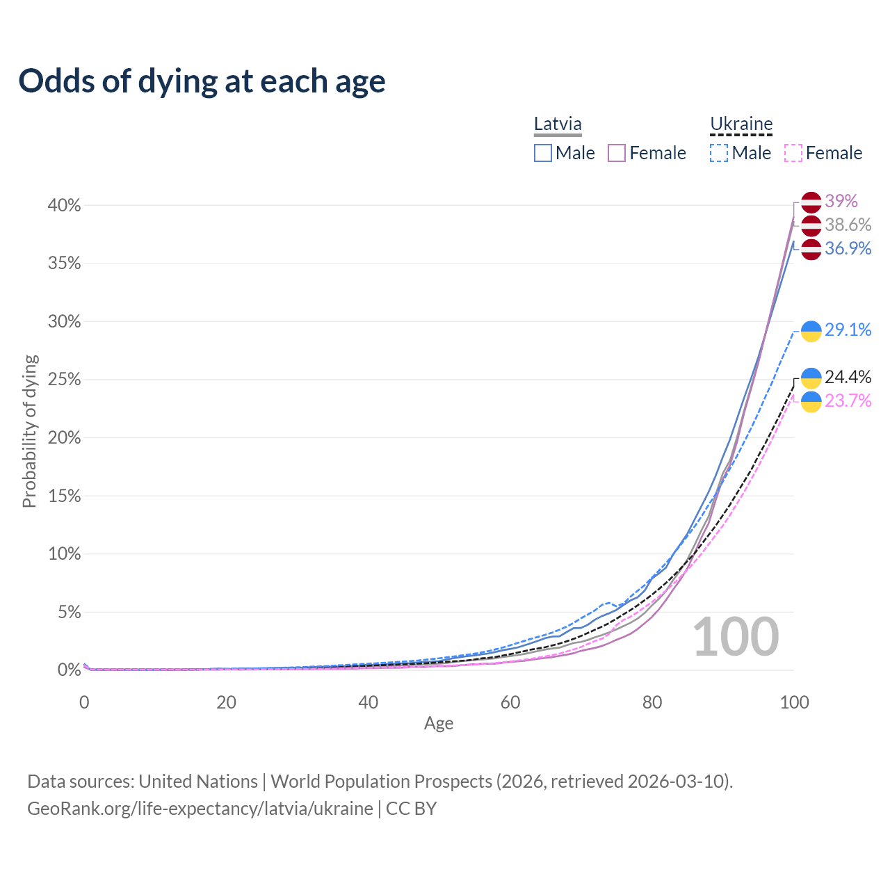 This life expectancy calculator shows the odds of living to 100, 95, 90, and below based on current age for both males and females in Latvia and Ukraine, along with mean and median age of death. The calculations are based on the 2026 life tables (actuarial tables) from the UN World Population Prospects.