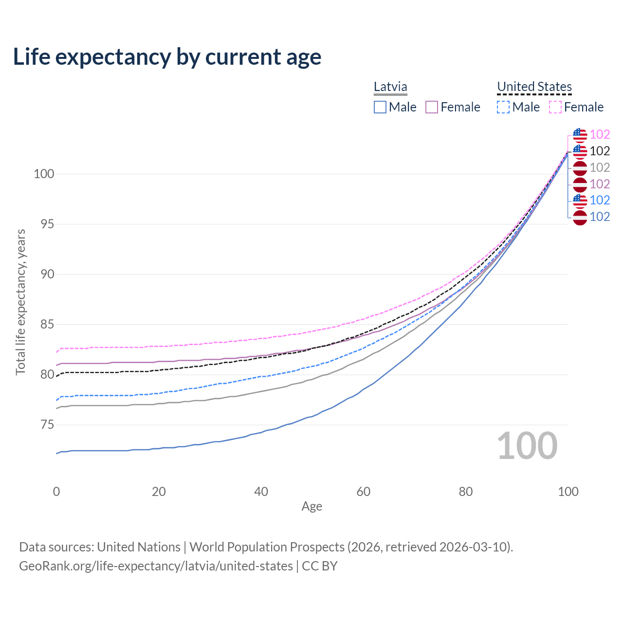 This life expectancy calculator shows the odds of living to 100, 95, 90, and below based on current age for both males and females in Latvia and the United States, along with mean and median age of death. The calculations are based on the 2026 life tables (actuarial tables) from the UN World Population Prospects.