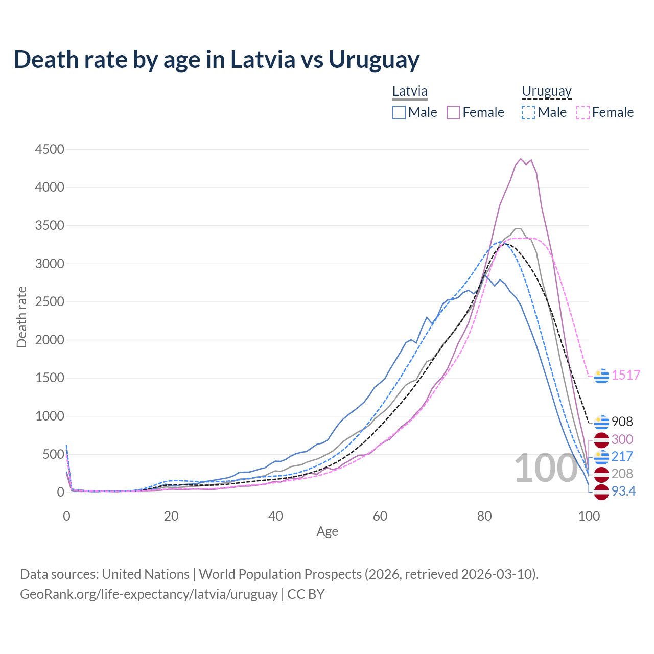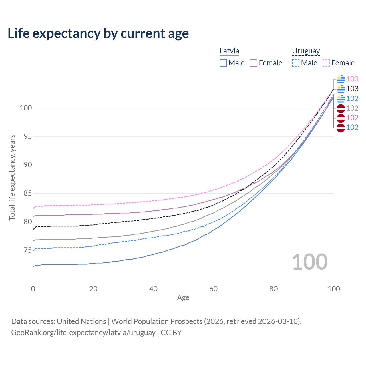 This life expectancy calculator shows the odds of living to 100, 95, 90, and below based on current age for both males and females in Latvia and Uruguay, along with mean and median age of death. The calculations are based on the 2026 life tables (actuarial tables) from the UN World Population Prospects.