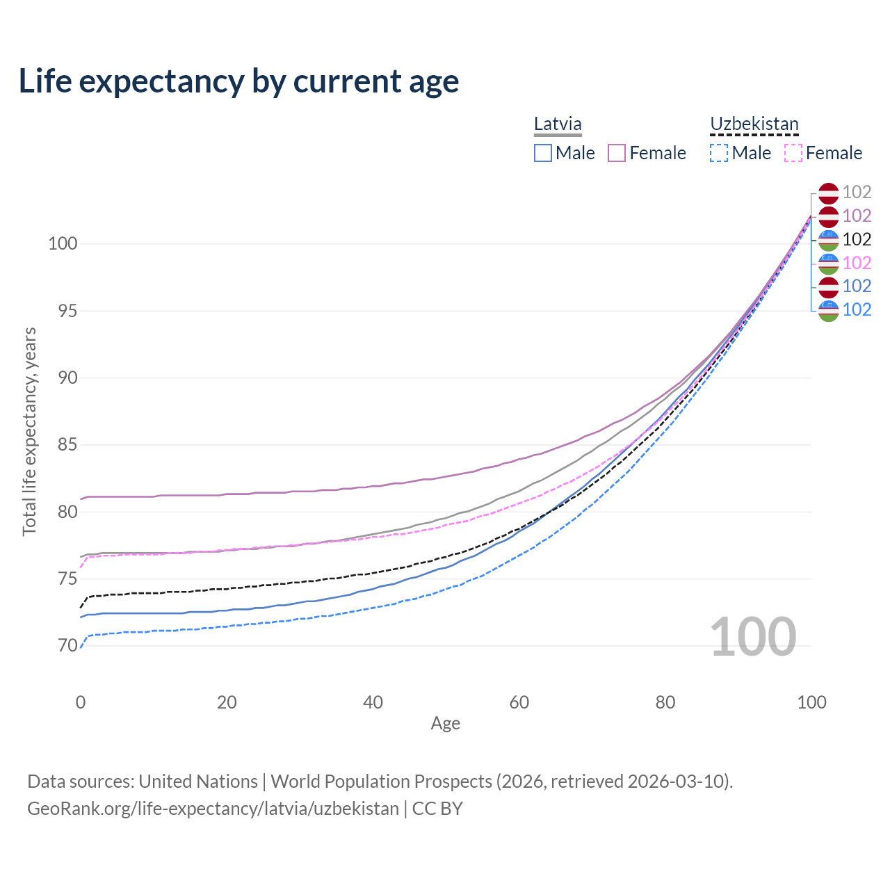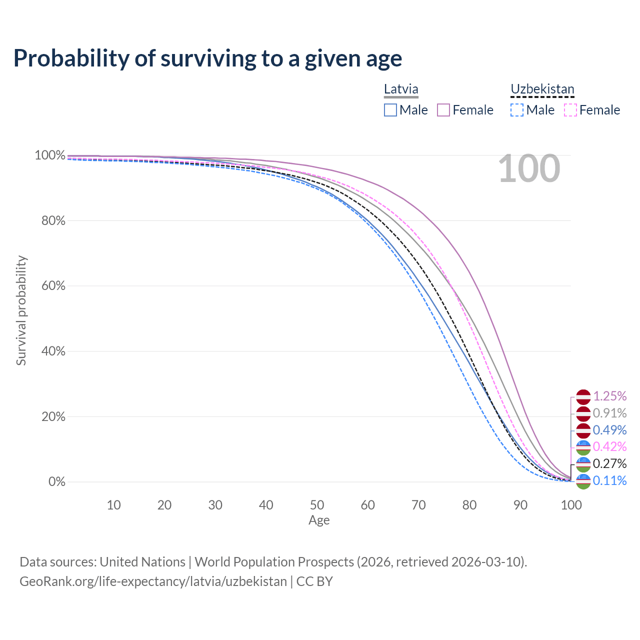 This life expectancy calculator shows the odds of living to 100, 95, 90, and below based on current age for both males and females in Latvia and Uzbekistan, along with mean and median age of death. The calculations are based on the 2026 life tables (actuarial tables) from the UN World Population Prospects.