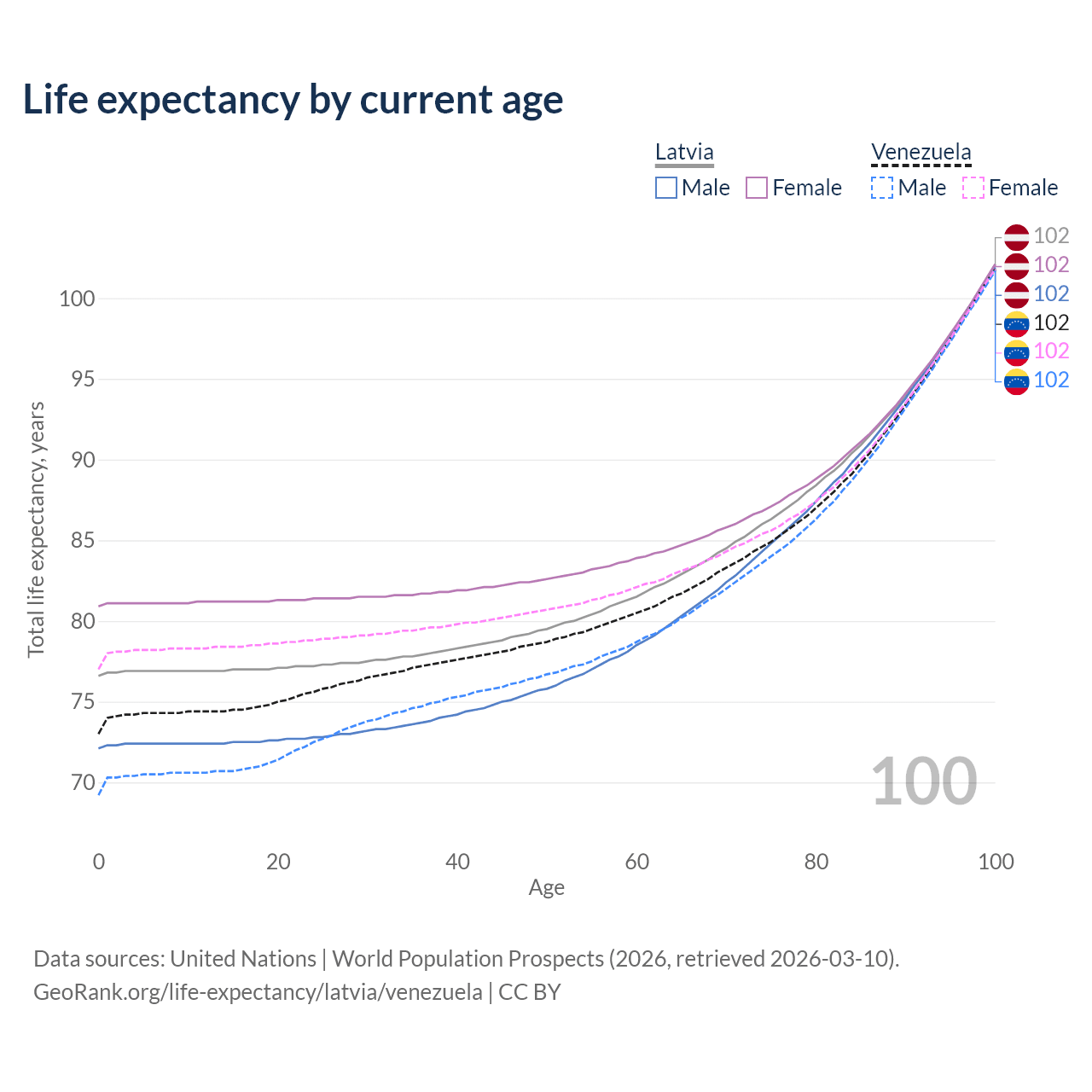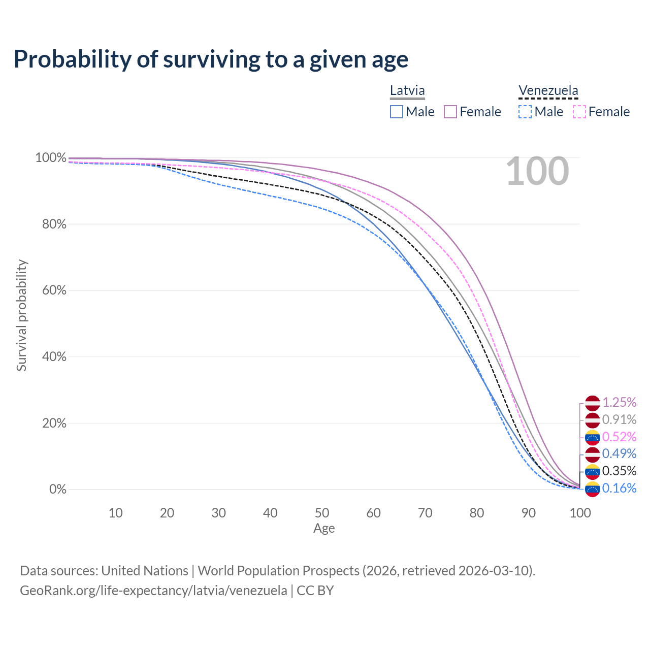 This life expectancy calculator shows the odds of living to 100, 95, 90, and below based on current age for both males and females in Latvia and Venezuela, along with mean and median age of death. The calculations are based on the 2026 life tables (actuarial tables) from the UN World Population Prospects.