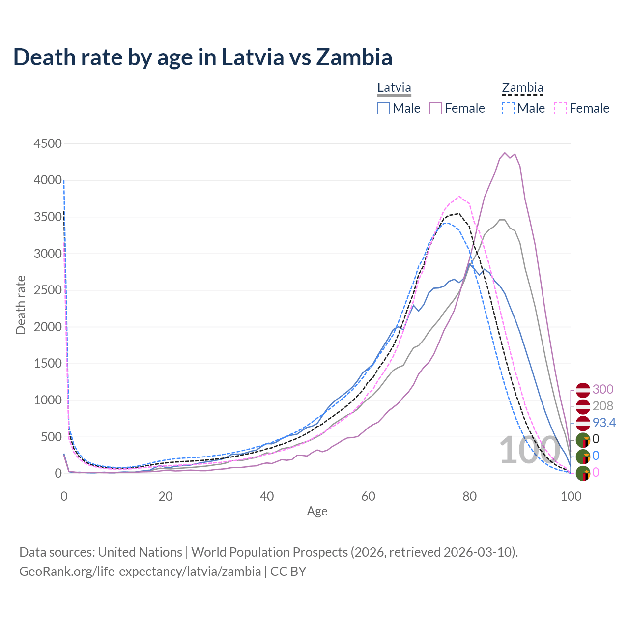 In Latvia, the most common age of death is 87, compared to 0 in Zambia. The median age of death is 80.4 in Latvia and 73.1 in Zambia, meaning only half of each cohort is expected to live past that age.