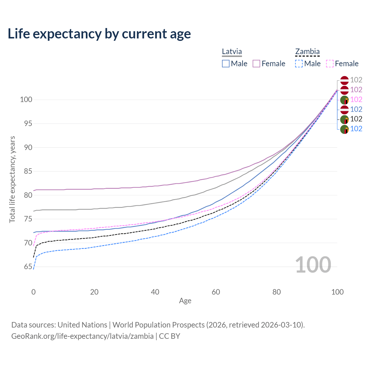 This life expectancy calculator shows the odds of living to 100, 95, 90, and below based on current age for both males and females in Latvia and Zambia, along with mean and median age of death. The calculations are based on the 2026 life tables (actuarial tables) from the UN World Population Prospects.