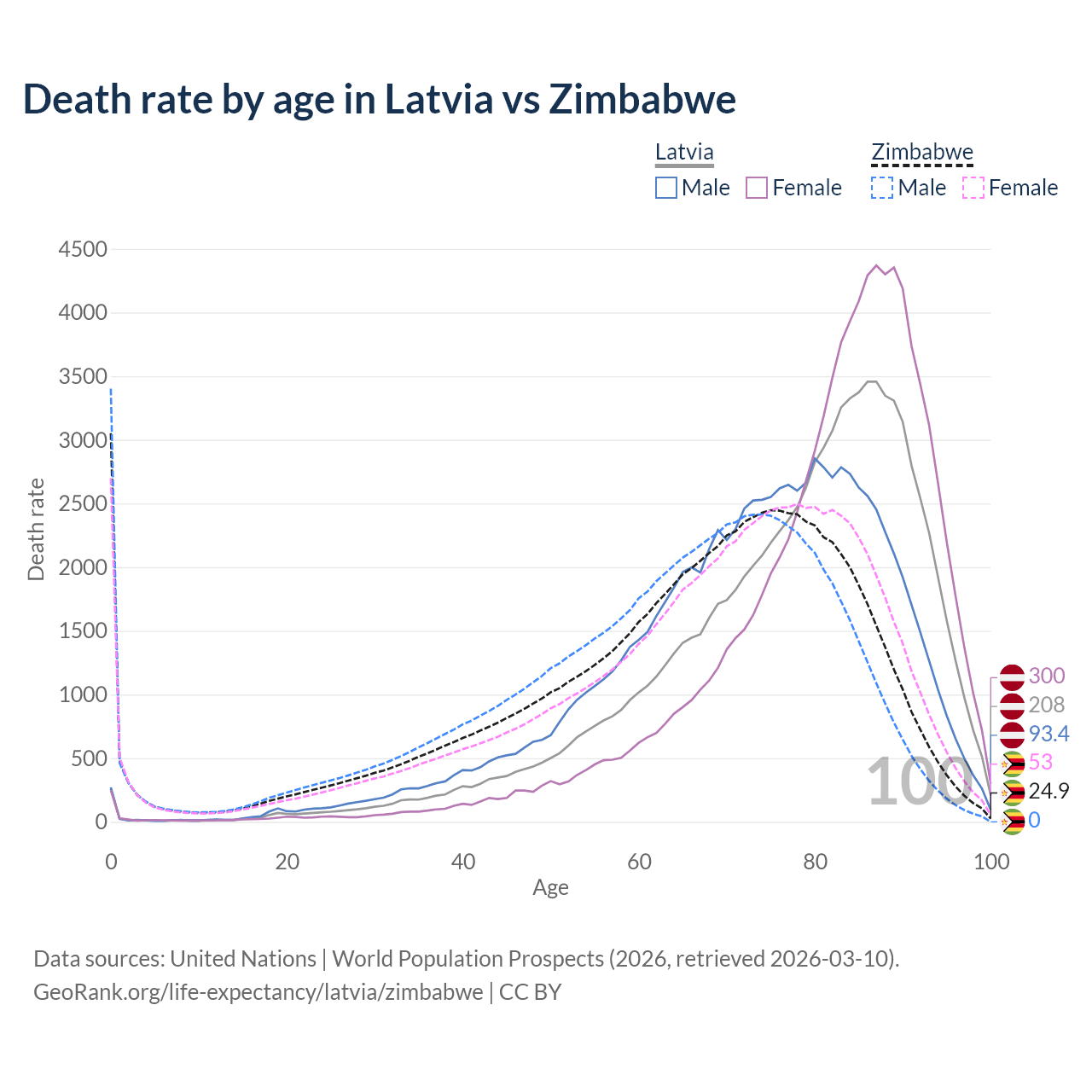 In Latvia, the most common age of death is 87, compared to 0 in Zimbabwe. The median age of death is 80.4 in Latvia and 68.8 in Zimbabwe, meaning only half of each cohort is expected to live past that age.