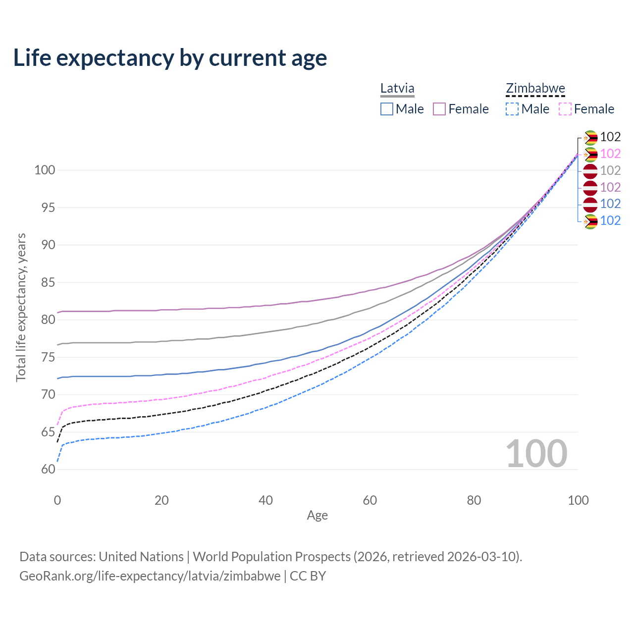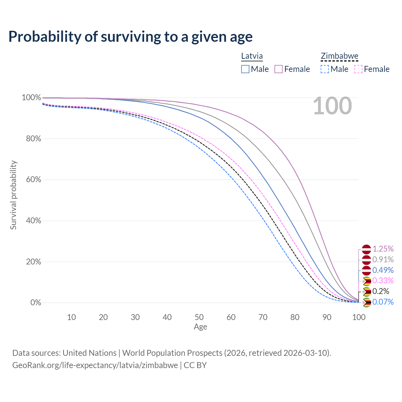 This life expectancy calculator shows the odds of living to 100, 95, 90, and below based on current age for both males and females in Latvia and Zimbabwe, along with mean and median age of death. The calculations are based on the 2026 life tables (actuarial tables) from the UN World Population Prospects.