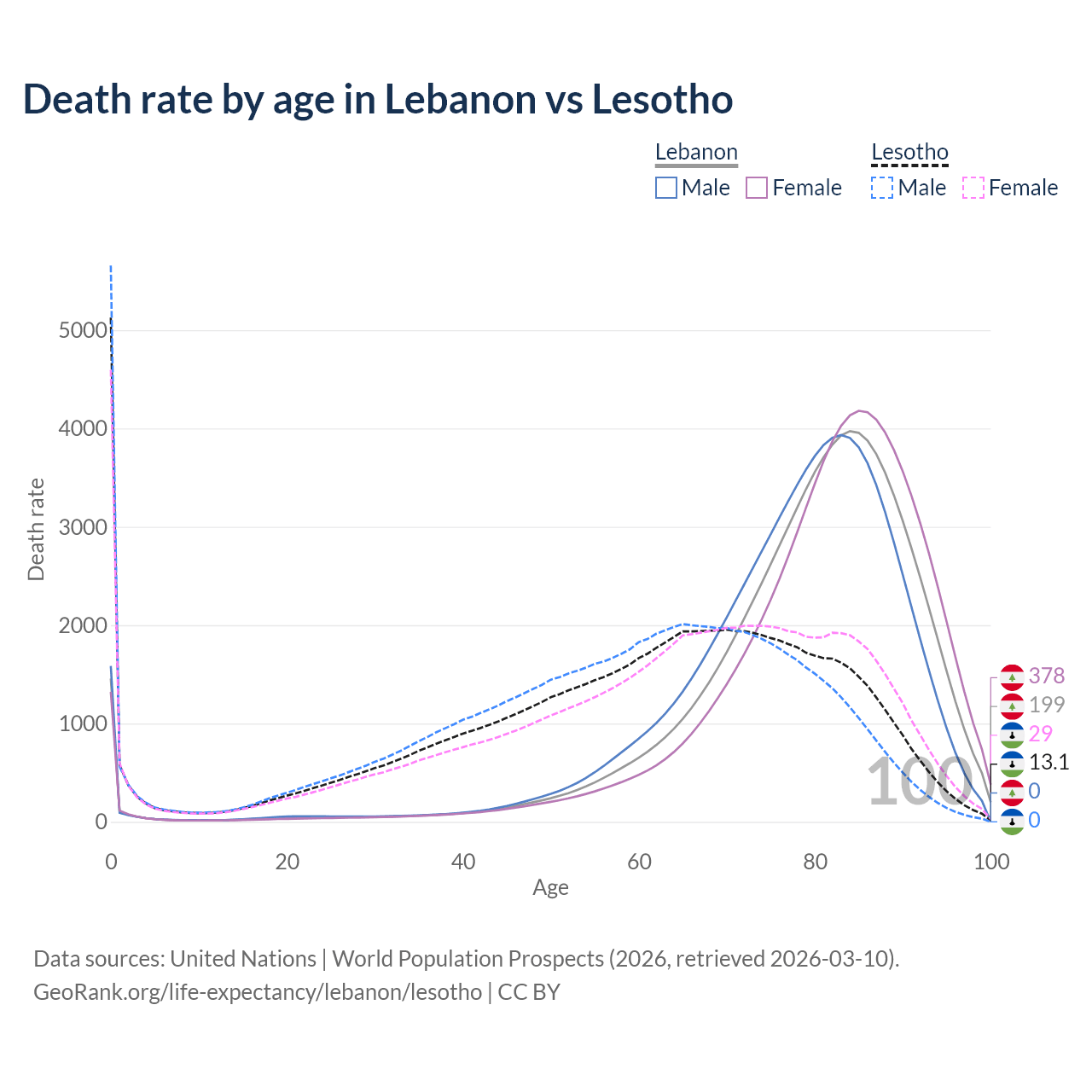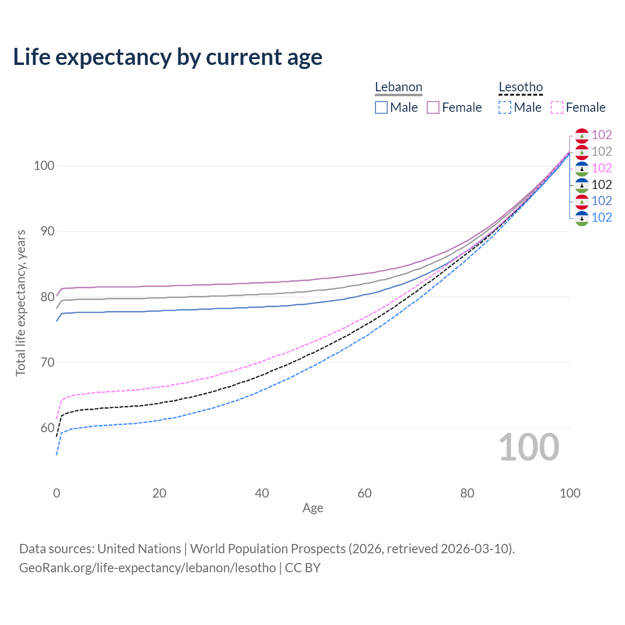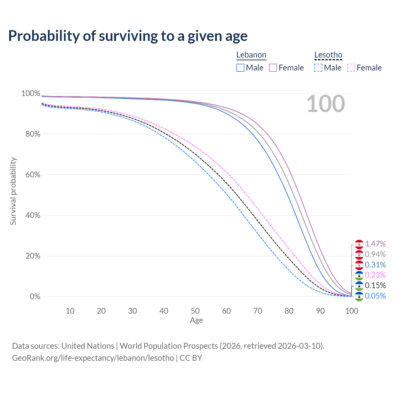 This life expectancy calculator shows the odds of living to 100, 95, 90, and below based on current age for both males and females in Lebanon and Lesotho, along with mean and median age of death. The calculations are based on the 2026 life tables (actuarial tables) from the UN World Population Prospects.