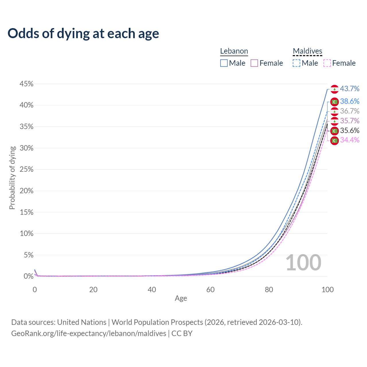 This life expectancy calculator shows the odds of living to 100, 95, 90, and below based on current age for both males and females in Lebanon and Maldives, along with mean and median age of death. The calculations are based on the 2026 life tables (actuarial tables) from the UN World Population Prospects.