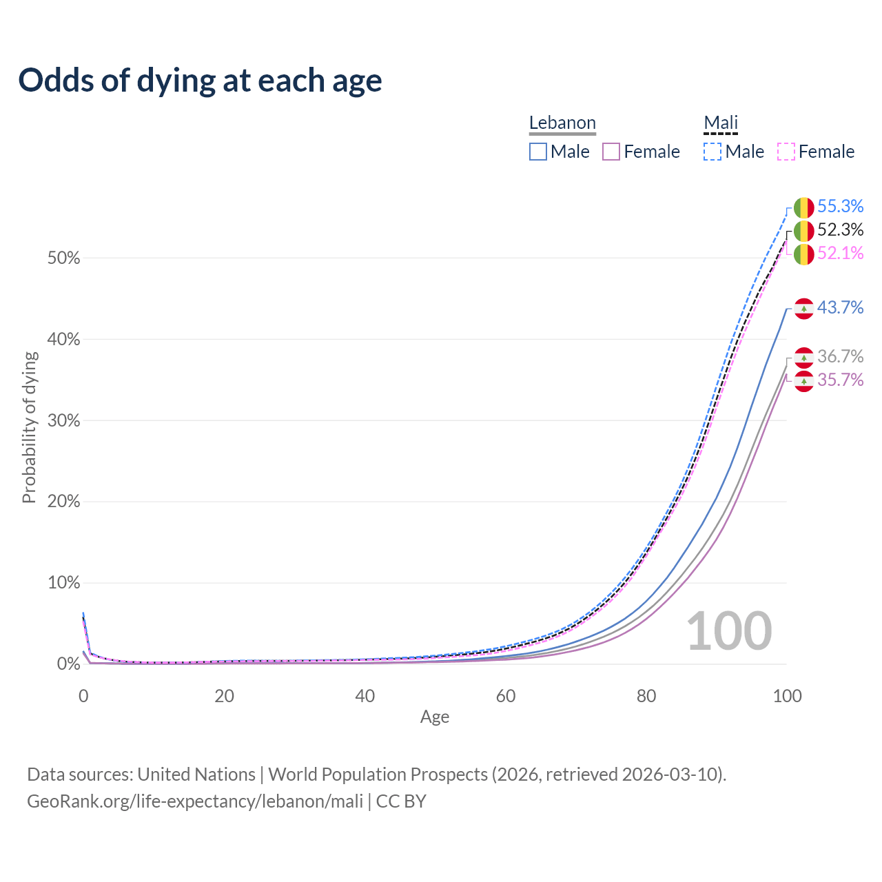This life expectancy calculator shows the odds of living to 100, 95, 90, and below based on current age for both males and females in Lebanon and Mali, along with mean and median age of death. The calculations are based on the 2026 life tables (actuarial tables) from the UN World Population Prospects.