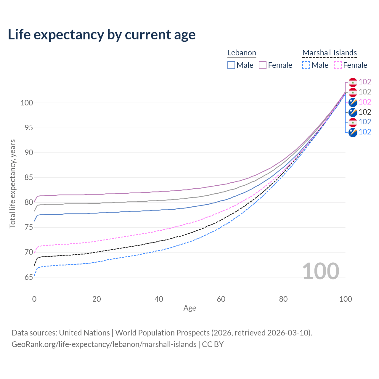 This life expectancy calculator shows the odds of living to 100, 95, 90, and below based on current age for both males and females in Lebanon and the Marshall Islands, along with mean and median age of death. The calculations are based on the 2026 life tables (actuarial tables) from the UN World Population Prospects.