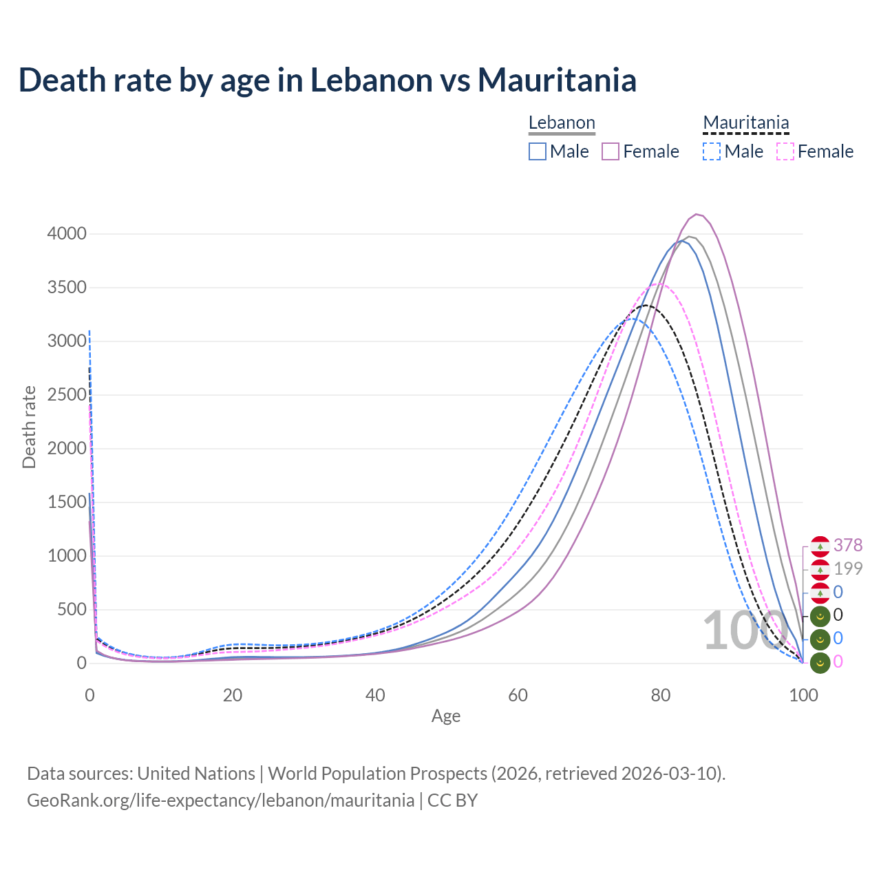 In Lebanon, the most common age of death is 84, compared to 78 in Mauritania. The median age of death is 81.6 in Lebanon and 74.1 in Mauritania, meaning only half of each cohort is expected to live past that age.