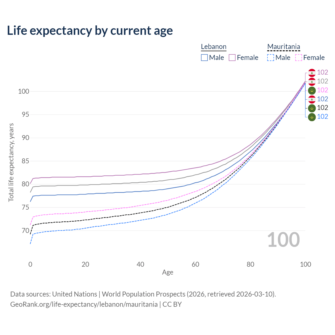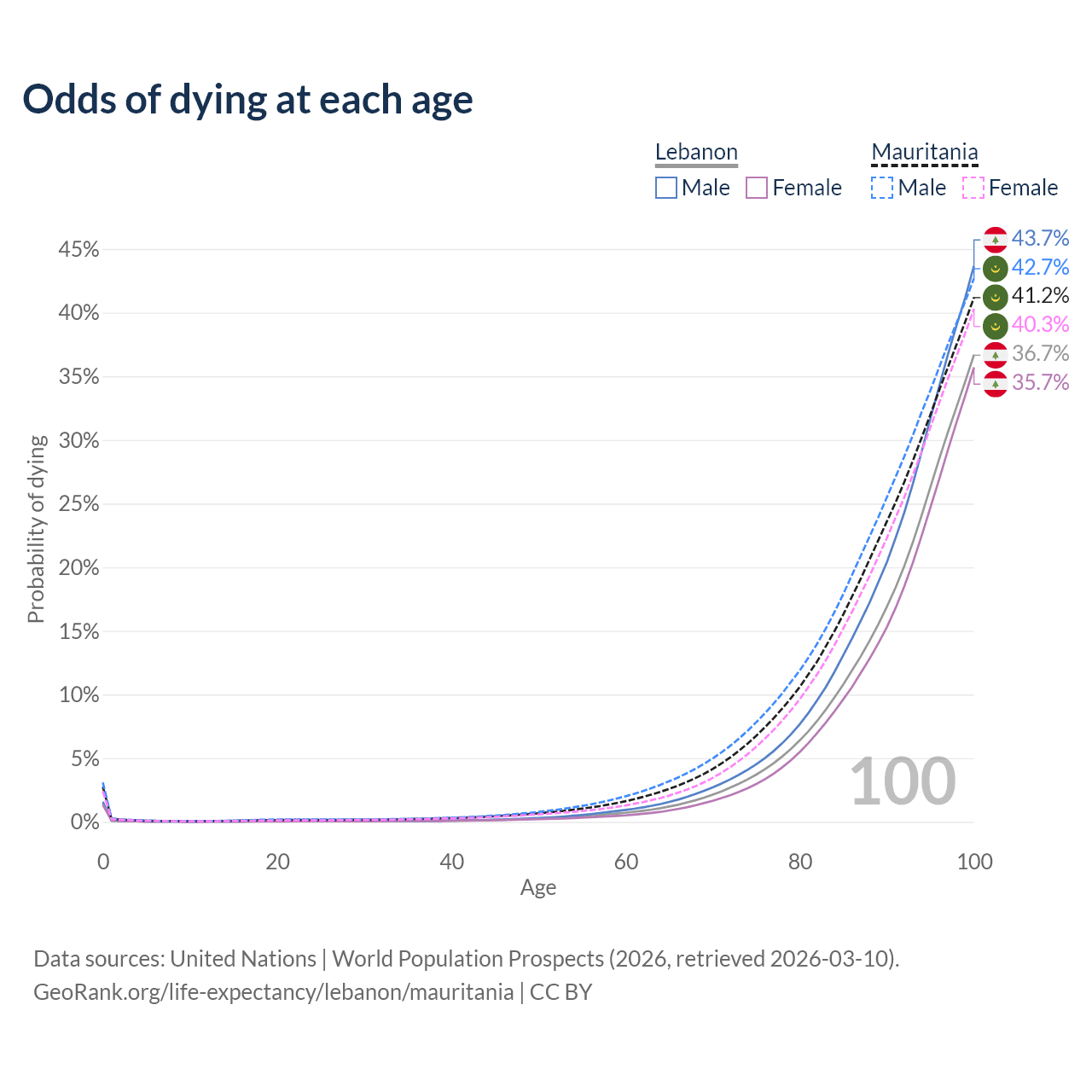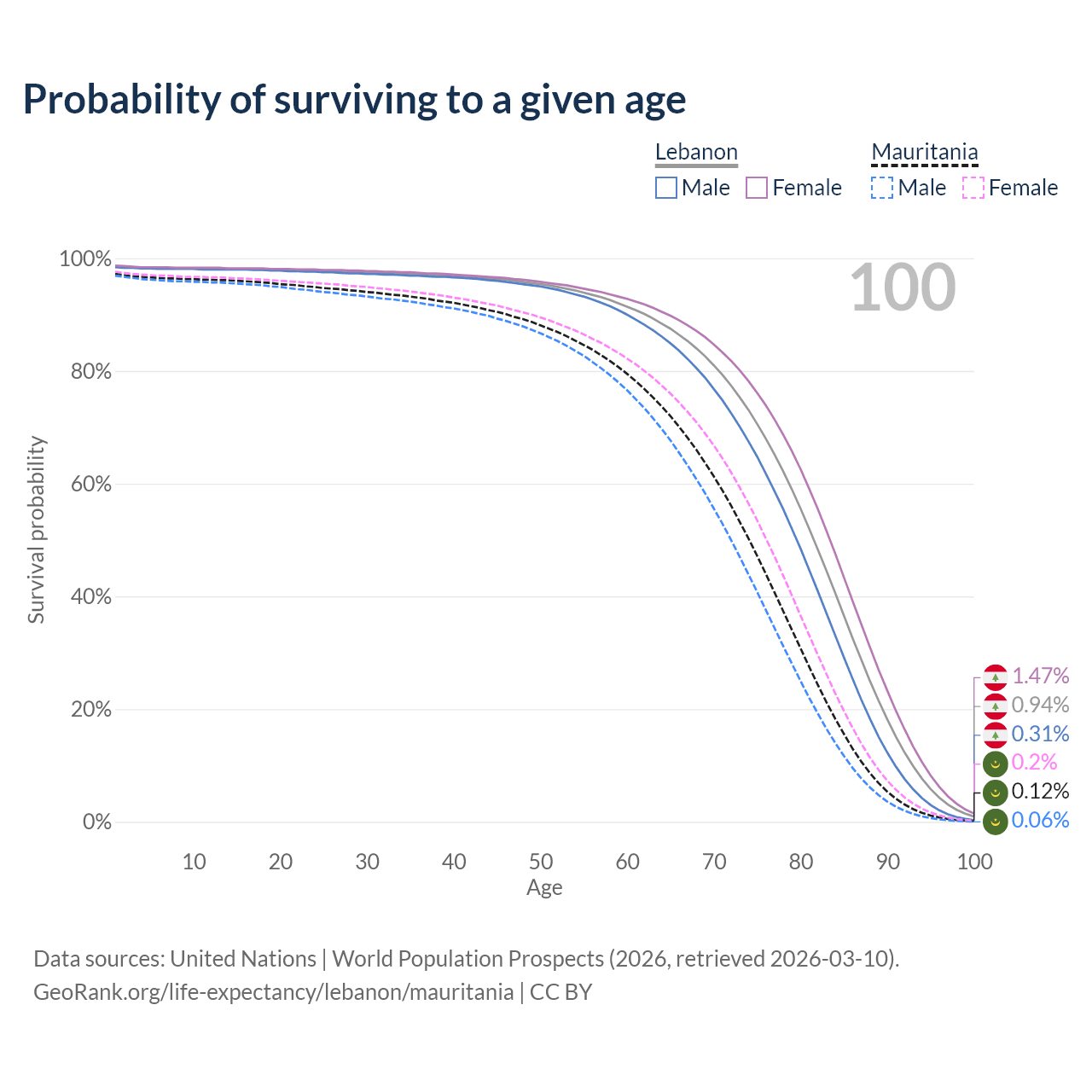 This life expectancy calculator shows the odds of living to 100, 95, 90, and below based on current age for both males and females in Lebanon and Mauritania, along with mean and median age of death. The calculations are based on the 2026 life tables (actuarial tables) from the UN World Population Prospects.