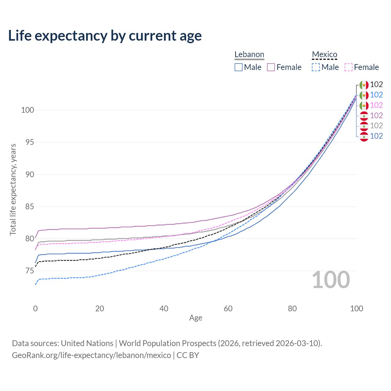 This life expectancy calculator shows the odds of living to 100, 95, 90, and below based on current age for both males and females in Lebanon and Mexico, along with mean and median age of death. The calculations are based on the 2026 life tables (actuarial tables) from the UN World Population Prospects.