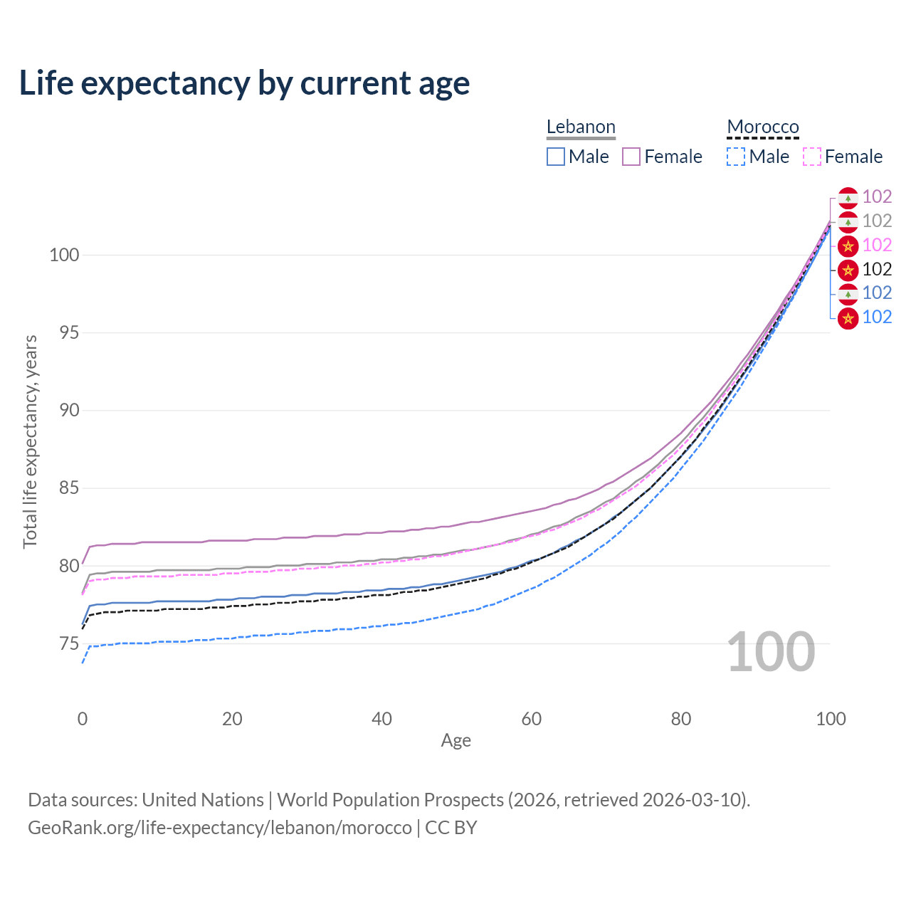 This life expectancy calculator shows the odds of living to 100, 95, 90, and below based on current age for both males and females in Lebanon and Morocco, along with mean and median age of death. The calculations are based on the 2026 life tables (actuarial tables) from the UN World Population Prospects.