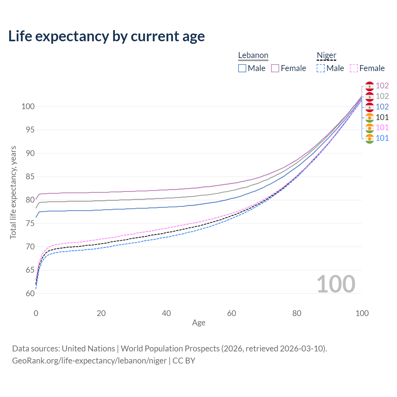 This life expectancy calculator shows the odds of living to 100, 95, 90, and below based on current age for both males and females in Lebanon and Niger, along with mean and median age of death. The calculations are based on the 2026 life tables (actuarial tables) from the UN World Population Prospects.