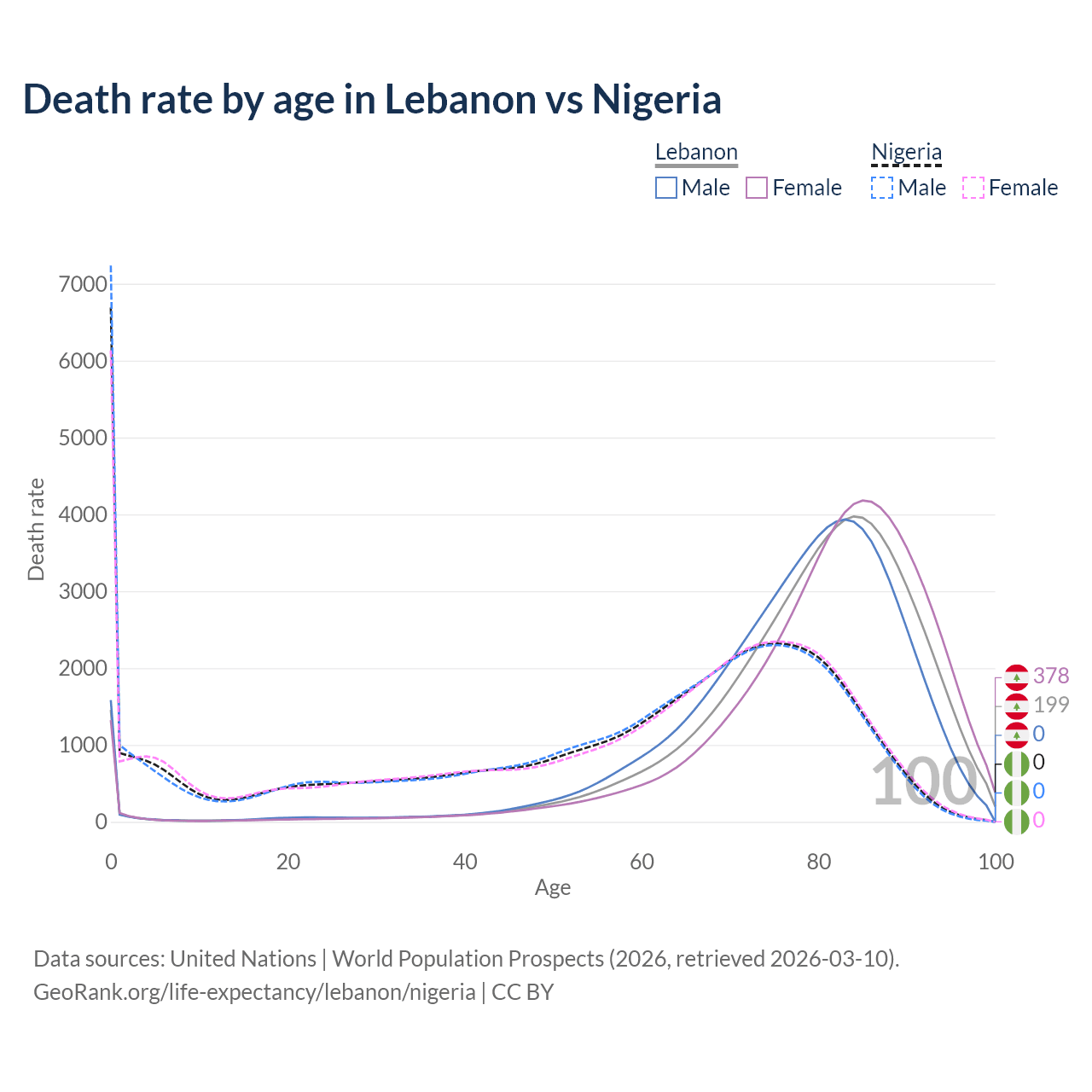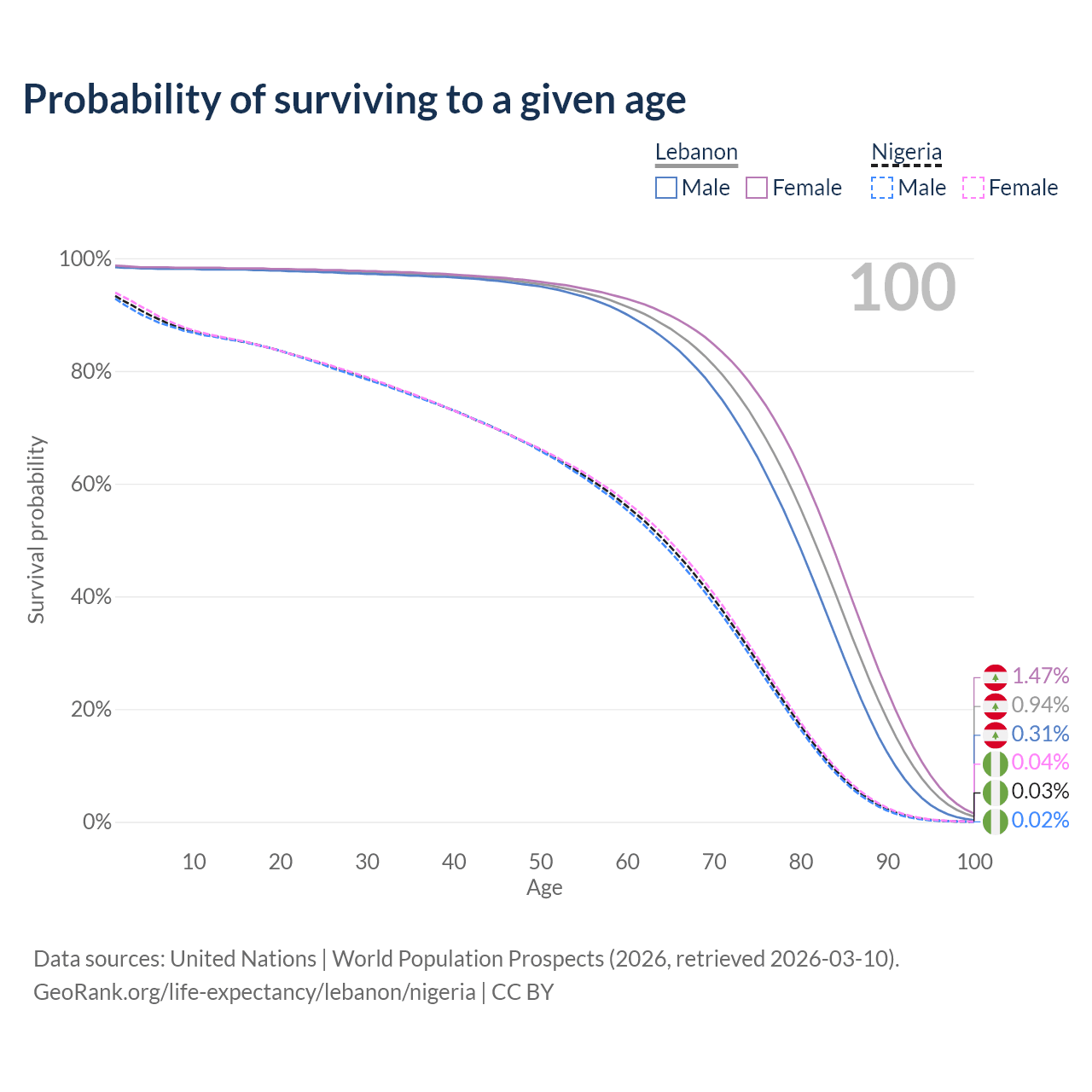 This life expectancy calculator shows the odds of living to 100, 95, 90, and below based on current age for both males and females in Lebanon and Nigeria, along with mean and median age of death. The calculations are based on the 2026 life tables (actuarial tables) from the UN World Population Prospects.