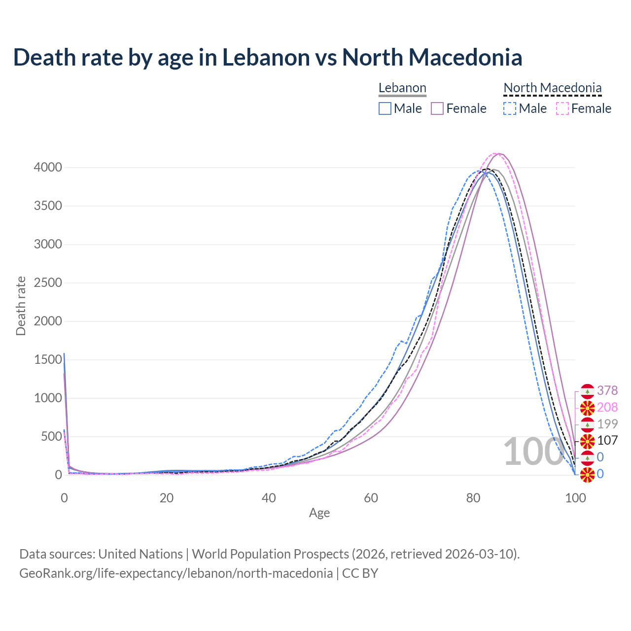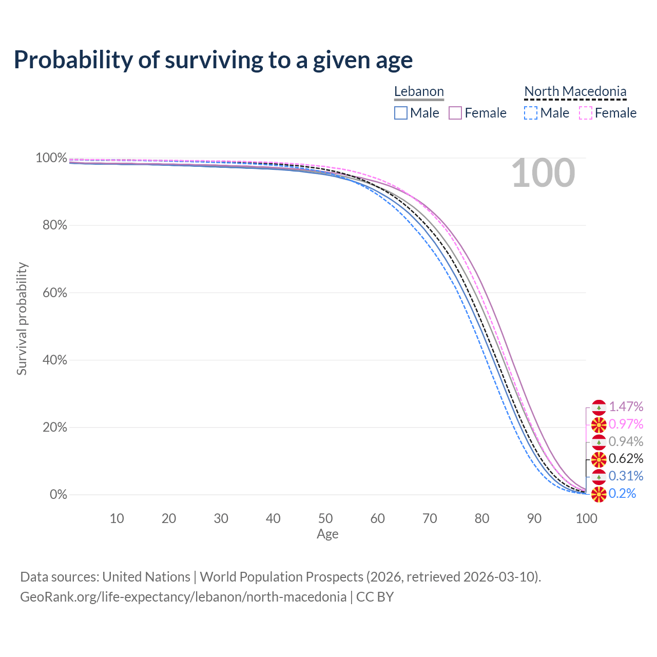 This life expectancy calculator shows the odds of living to 100, 95, 90, and below based on current age for both males and females in Lebanon and North Macedonia, along with mean and median age of death. The calculations are based on the 2026 life tables (actuarial tables) from the UN World Population Prospects.