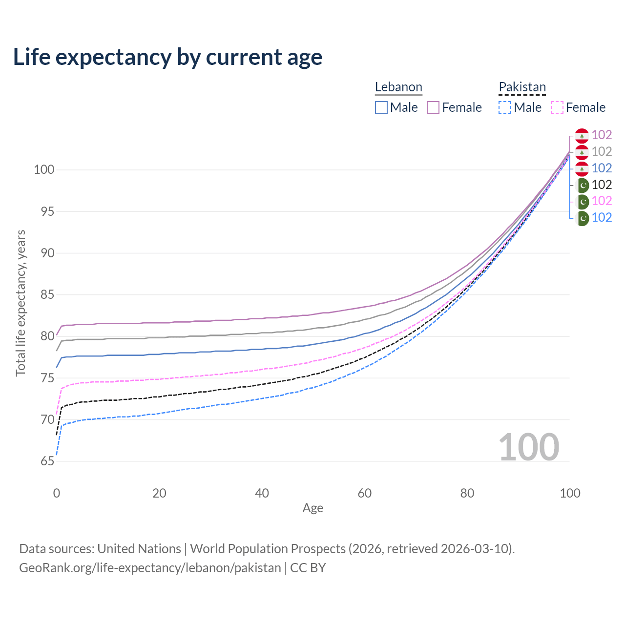 This life expectancy calculator shows the odds of living to 100, 95, 90, and below based on current age for both males and females in Lebanon and Pakistan, along with mean and median age of death. The calculations are based on the 2026 life tables (actuarial tables) from the UN World Population Prospects.
