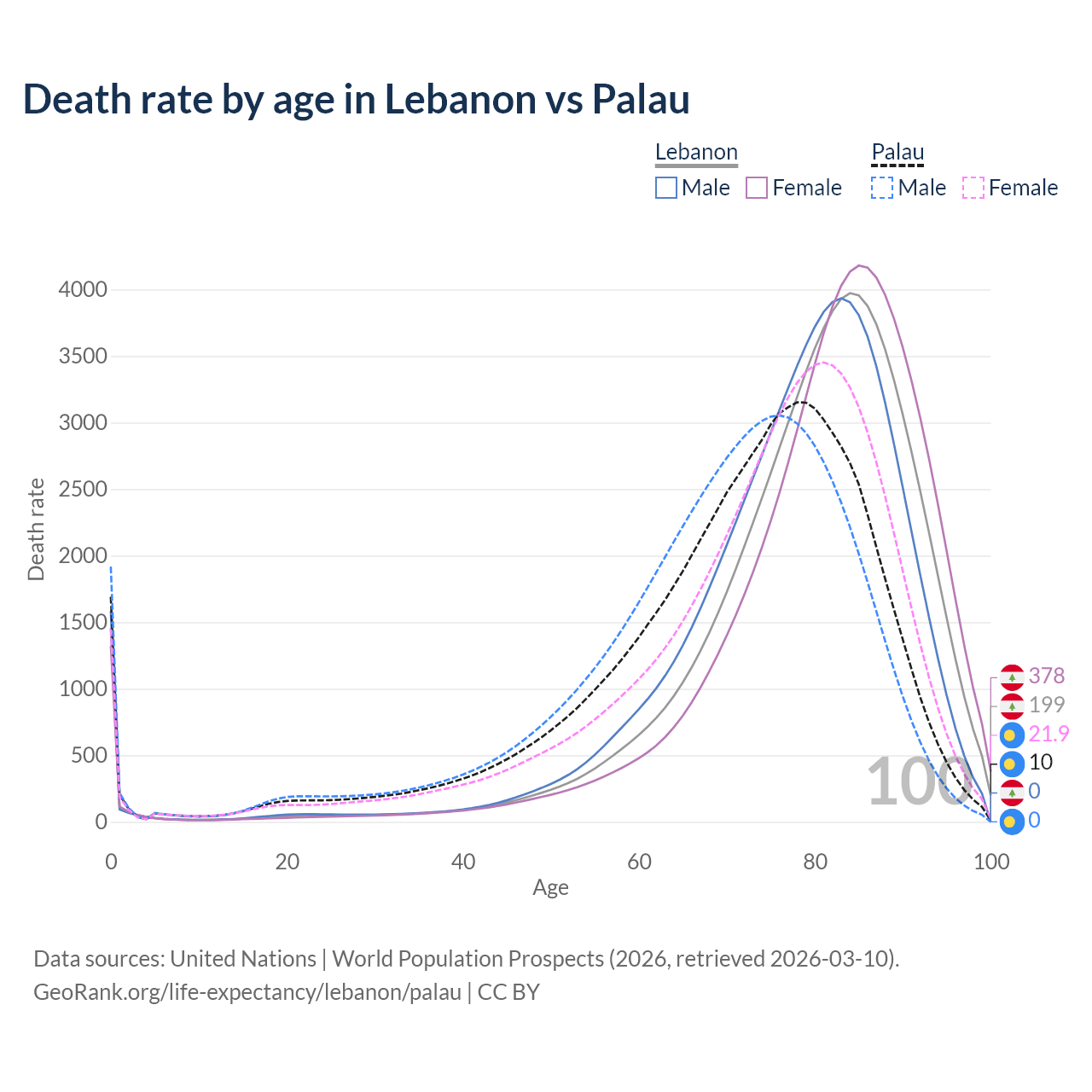 In Lebanon, the most common age of death is 84, compared to 78 in Palau. The median age of death is 81.6 in Lebanon and 73.8 in Palau, meaning only half of each cohort is expected to live past that age.