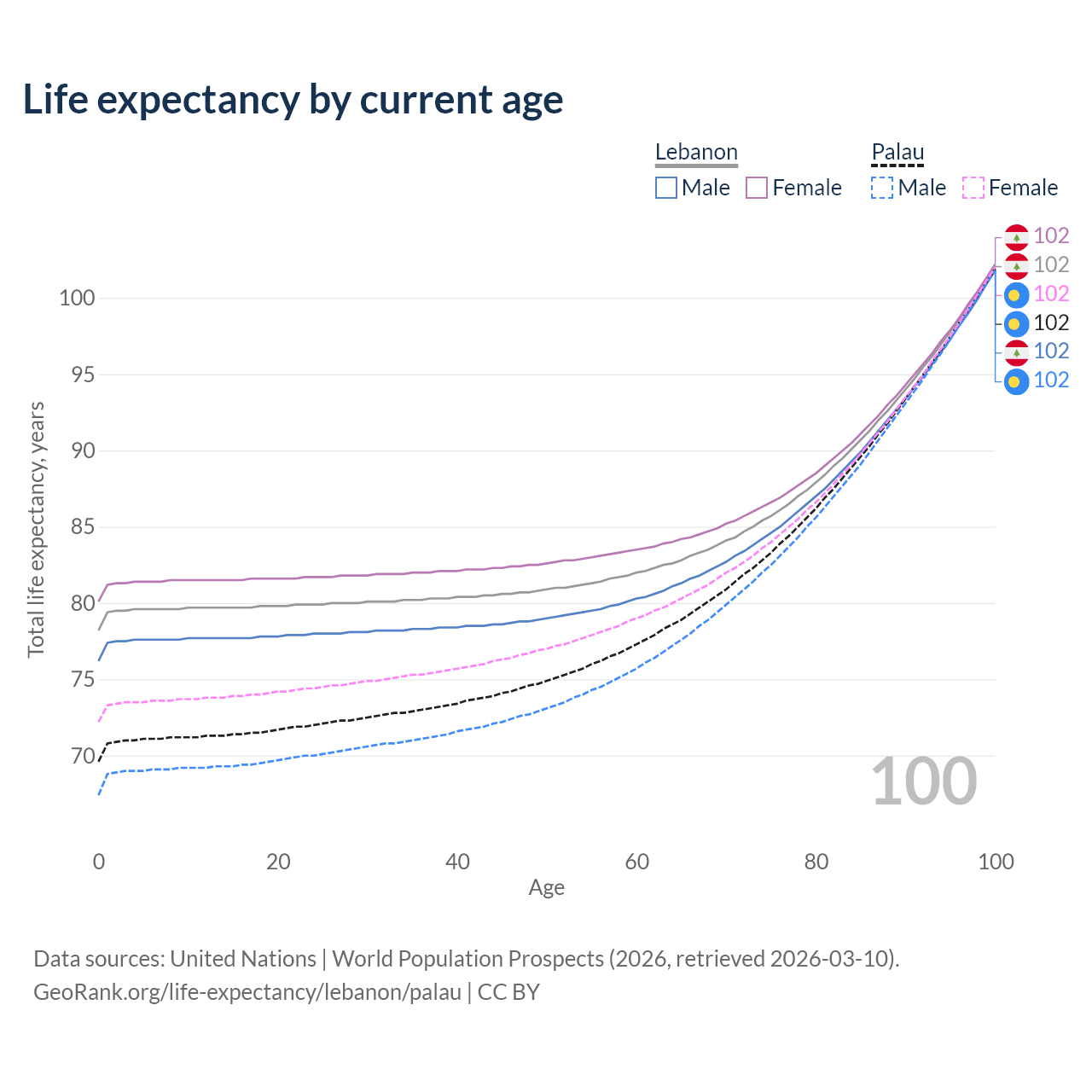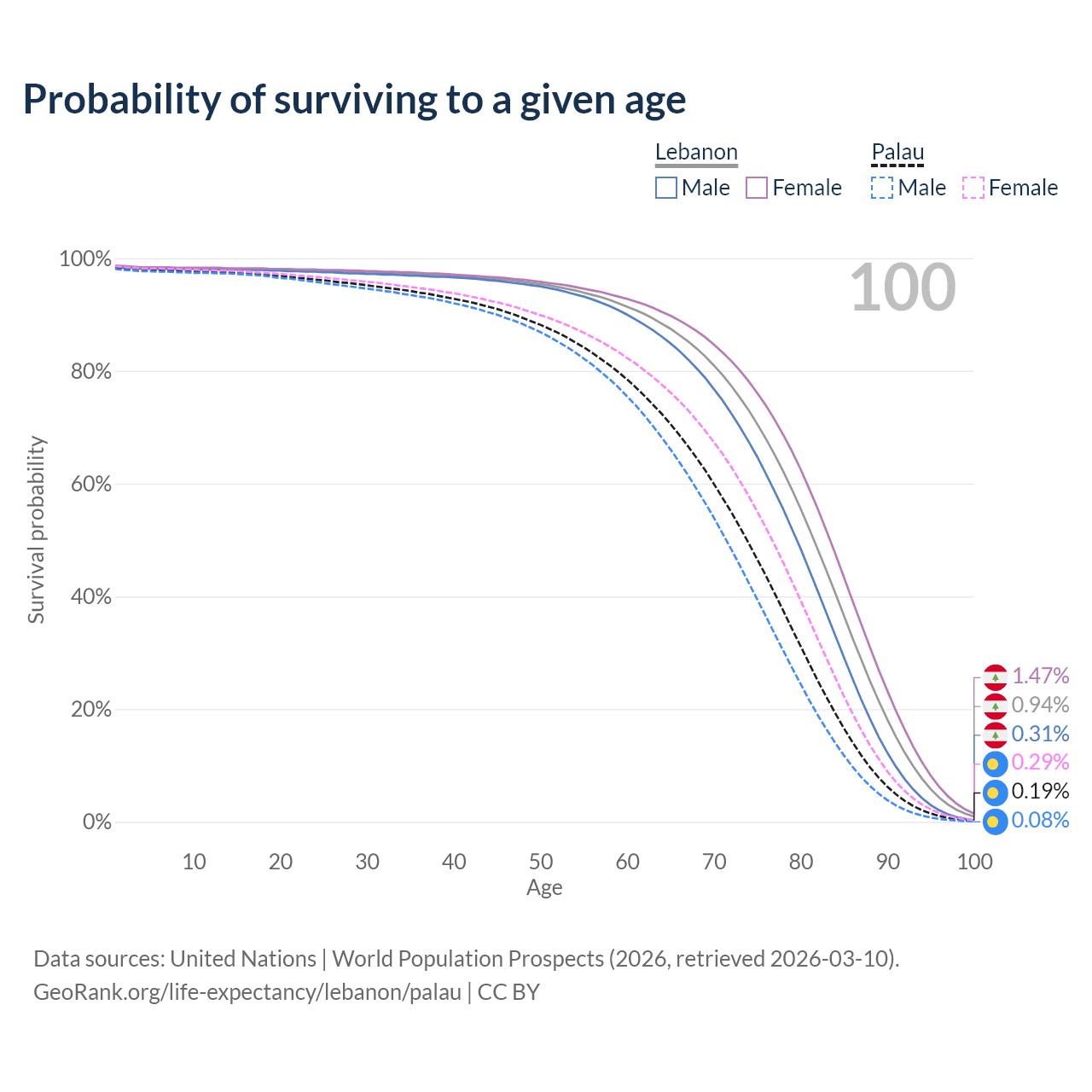 This life expectancy calculator shows the odds of living to 100, 95, 90, and below based on current age for both males and females in Lebanon and Palau, along with mean and median age of death. The calculations are based on the 2026 life tables (actuarial tables) from the UN World Population Prospects.