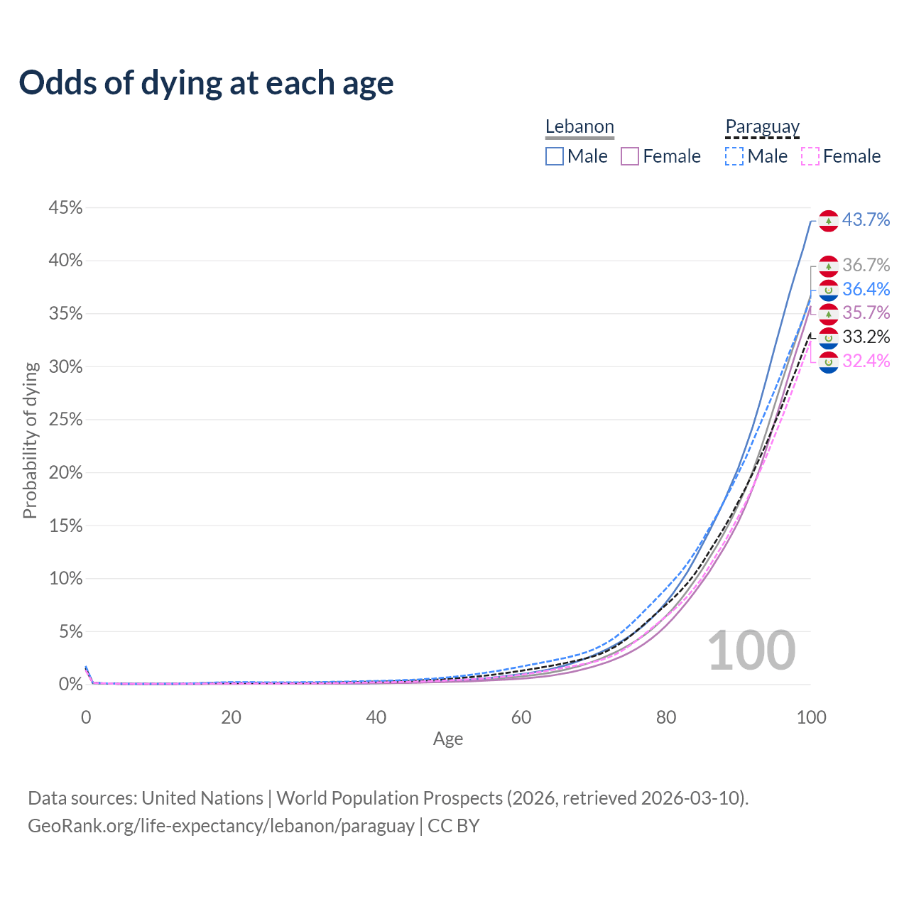 This life expectancy calculator shows the odds of living to 100, 95, 90, and below based on current age for both males and females in Lebanon and Paraguay, along with mean and median age of death. The calculations are based on the 2026 life tables (actuarial tables) from the UN World Population Prospects.