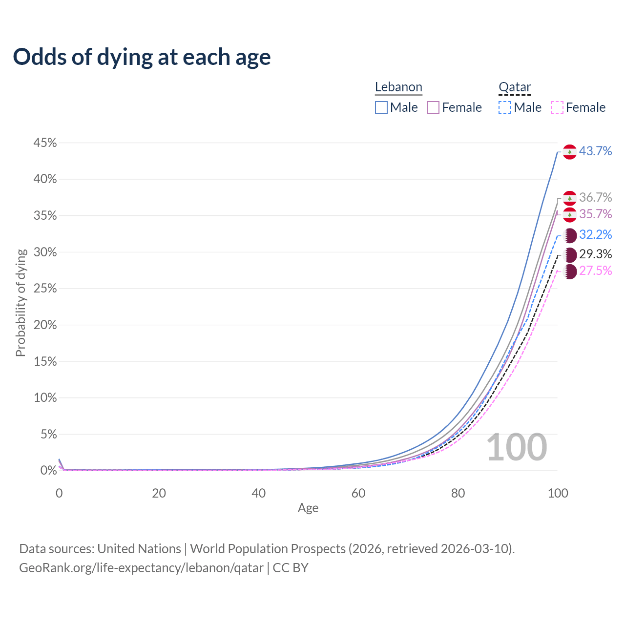 This life expectancy calculator shows the odds of living to 100, 95, 90, and below based on current age for both males and females in Lebanon and Qatar, along with mean and median age of death. The calculations are based on the 2026 life tables (actuarial tables) from the UN World Population Prospects.