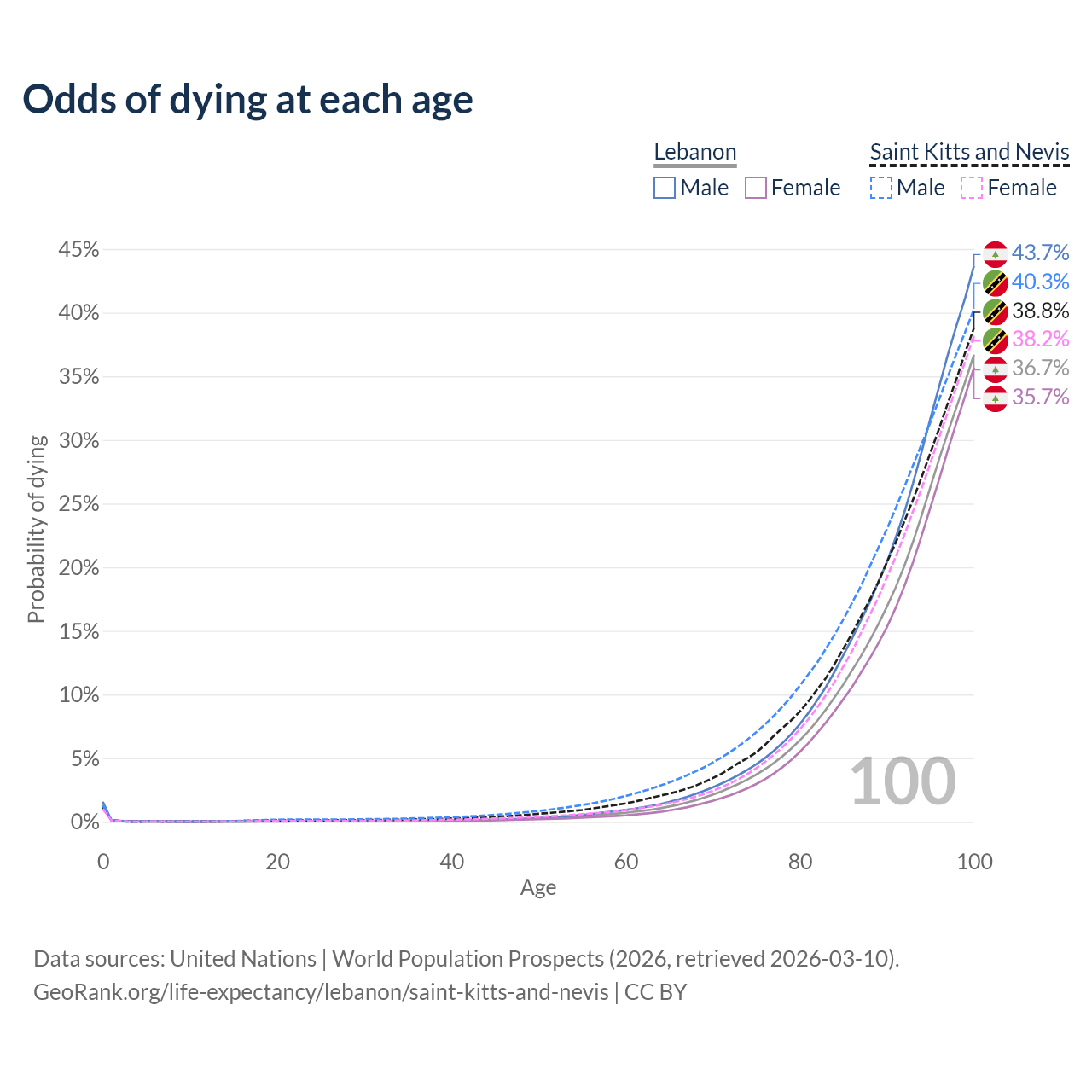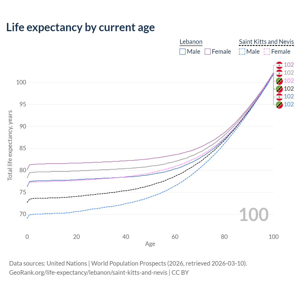 This life expectancy calculator shows the odds of living to 100, 95, 90, and below based on current age for both males and females in Lebanon and Saint Kitts and Nevis, along with mean and median age of death. The calculations are based on the 2026 life tables (actuarial tables) from the UN World Population Prospects.